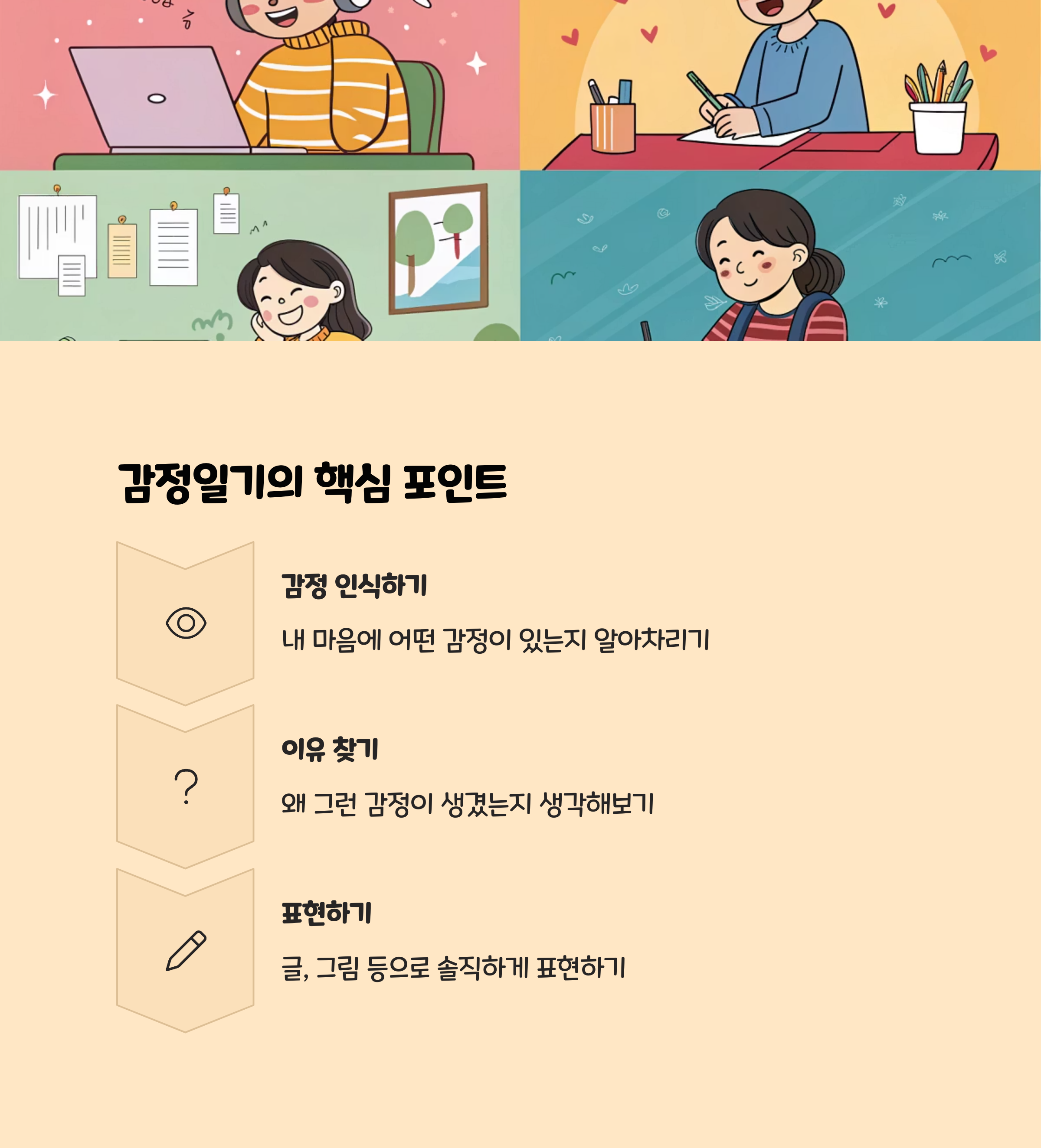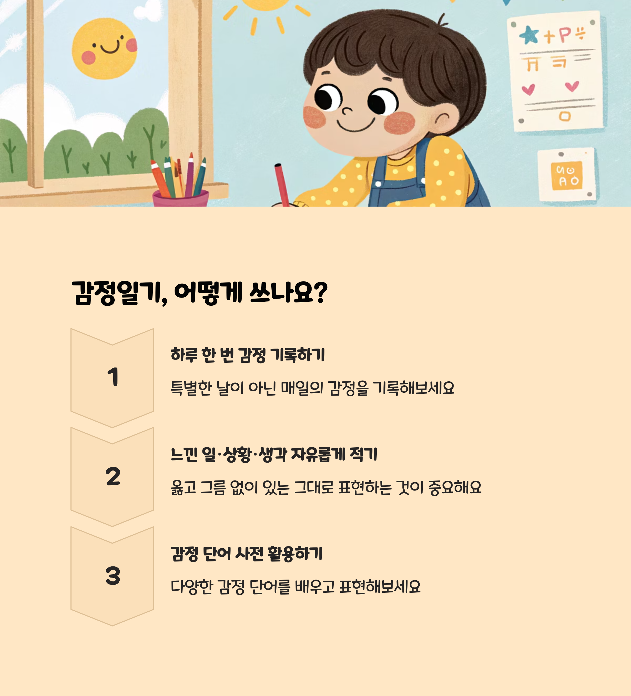본 내용은 EWC키즈의 감정일기 프로그램과 제주대학교 연구를 기반으로 합니다. 감정일기는 아이의 감정 표현력, 자아존중감, 메타인지능력 향상에 긍정적 영향을 주며, 6주간 실천한 초등학생들은 감정 표현과 글쓰기 능력이 뚜렷이 향상되었습니다.