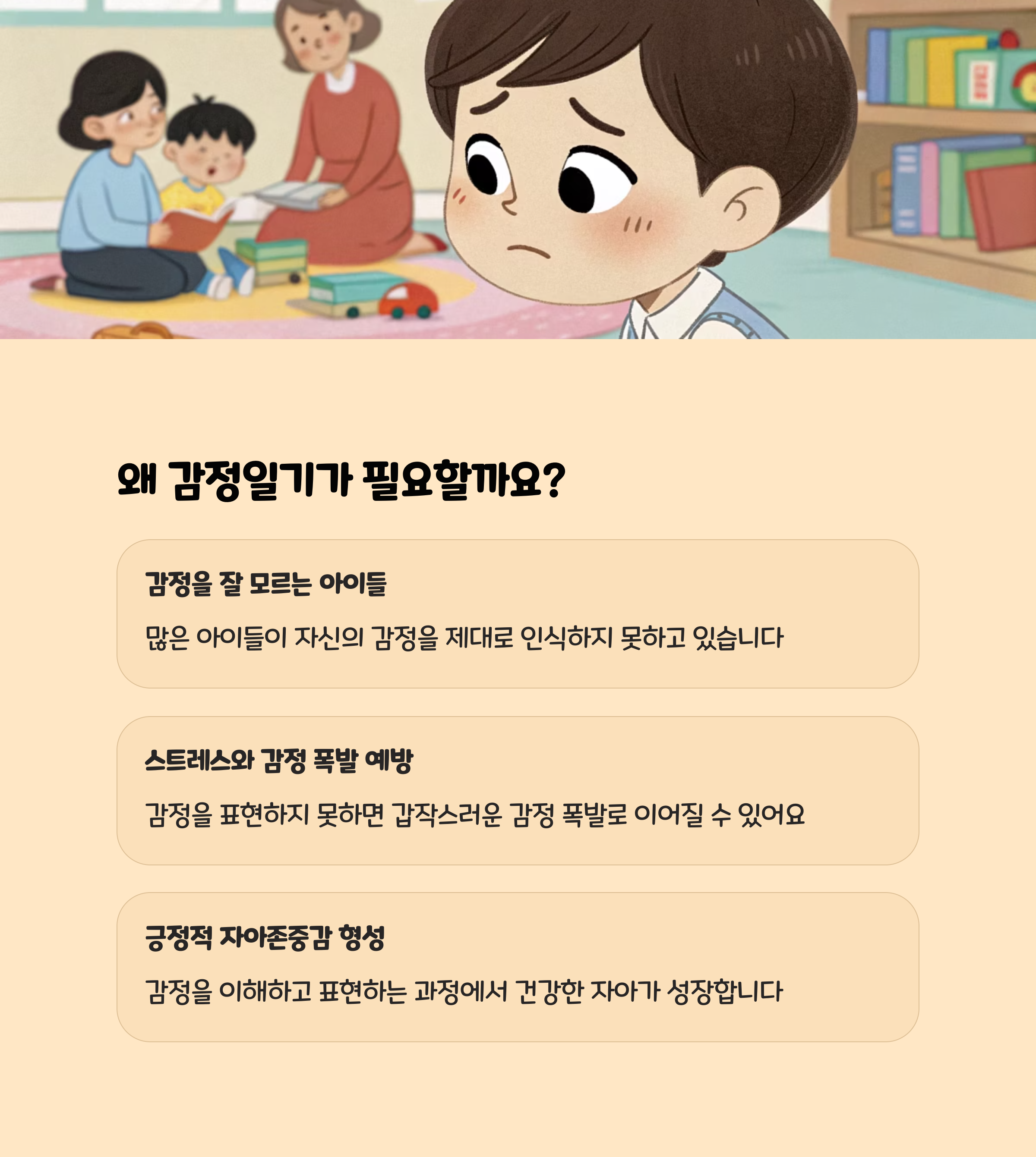 - 매일 혹은 주기적으로 아이와 함께 하루 동안 느꼈던 감정을 적어봅니다.