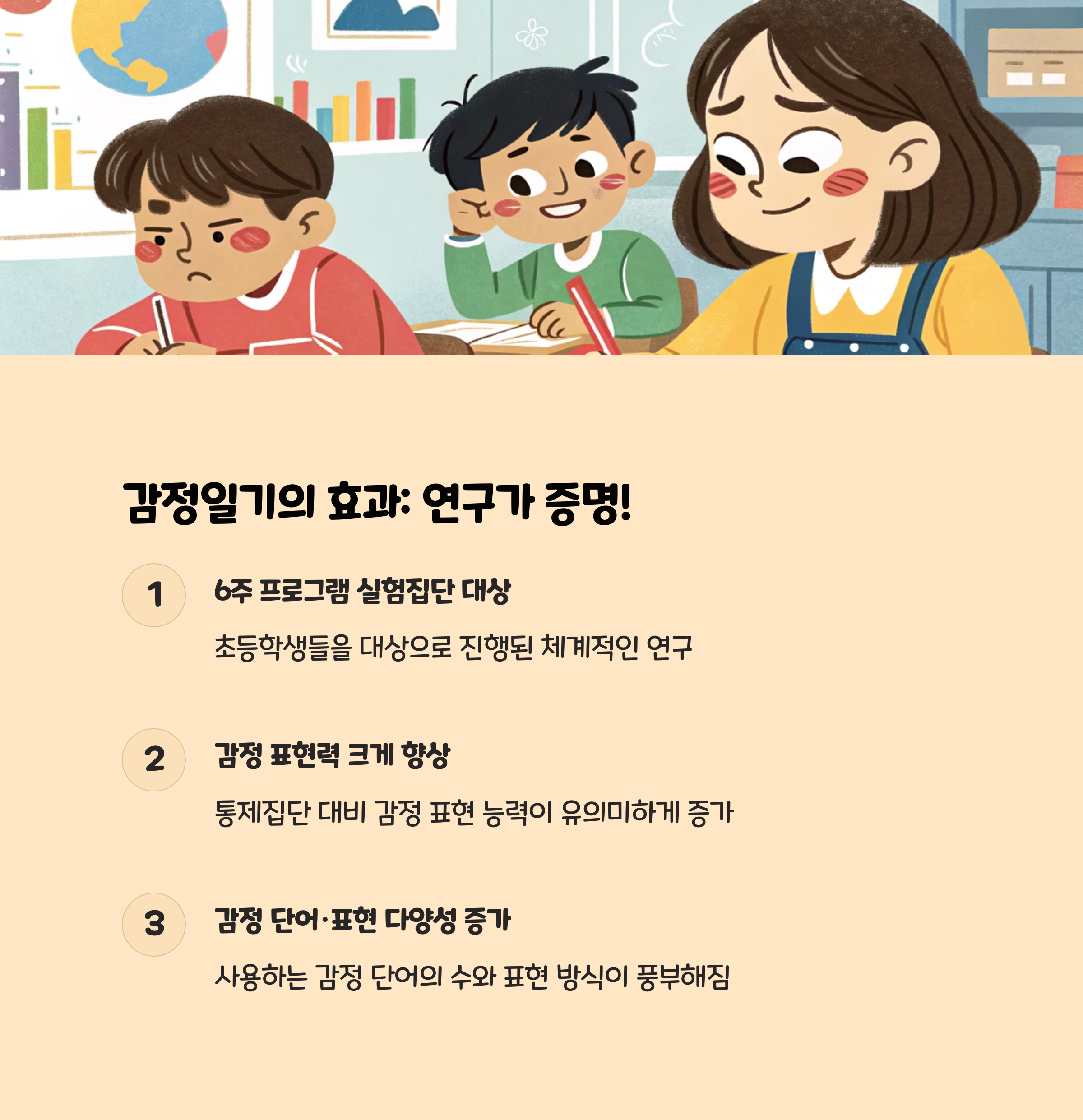 - 감정일기 프로그램에 6주간 참여한 초등학생 28명은 감정 표현 능력과 글쓰기 능력이 통제집단 29명보다 유의미하게 향상되었습니다.