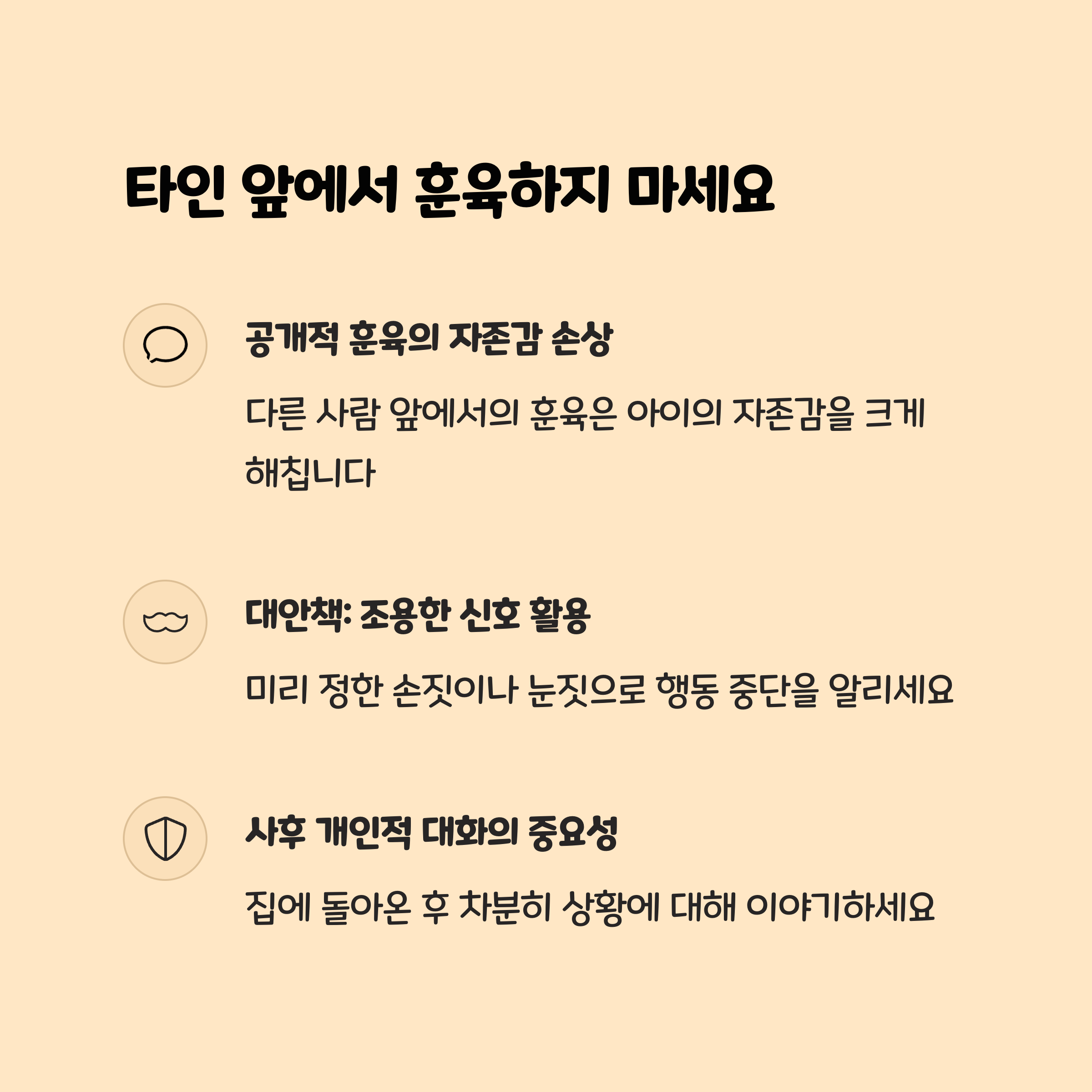 아이의 자존심을 보호하는 것도 중요합니다. 다른 사람, 특히 형제나 친구 앞에서 혼내면 아이는 수치심과 반발심만 키우게 됩니다. 훈육은 가능한 한 단둘이 있을 때 진행하세요.