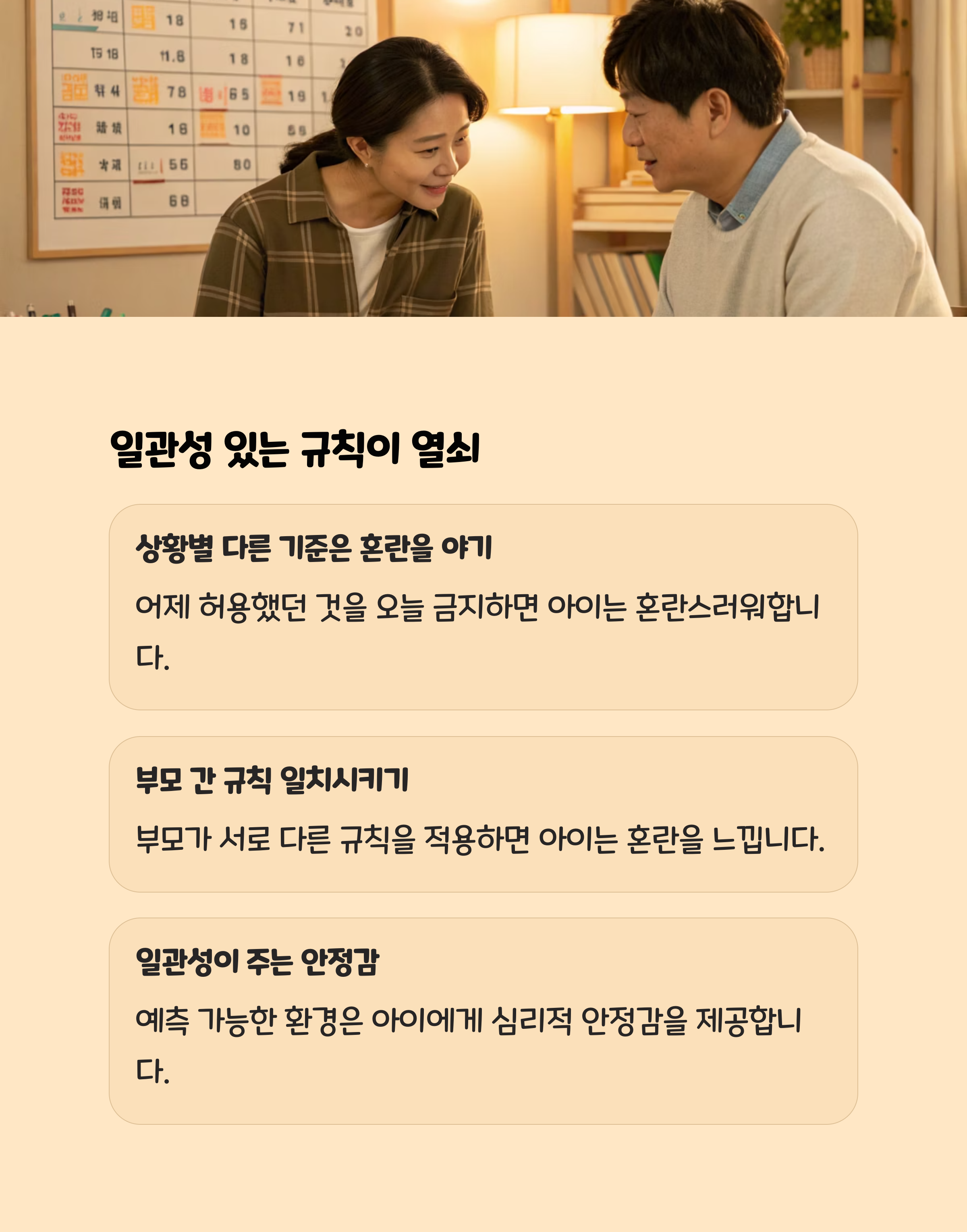 어제는 허락하고 오늘은 혼내는 식의 일관성 없는 태도는 아이를 혼란스럽게 만듭니다. 규칙과 훈육 기준을 항상 동일하게 적용해야 아이가 스스로 한계를 이해할 수 있습니다.