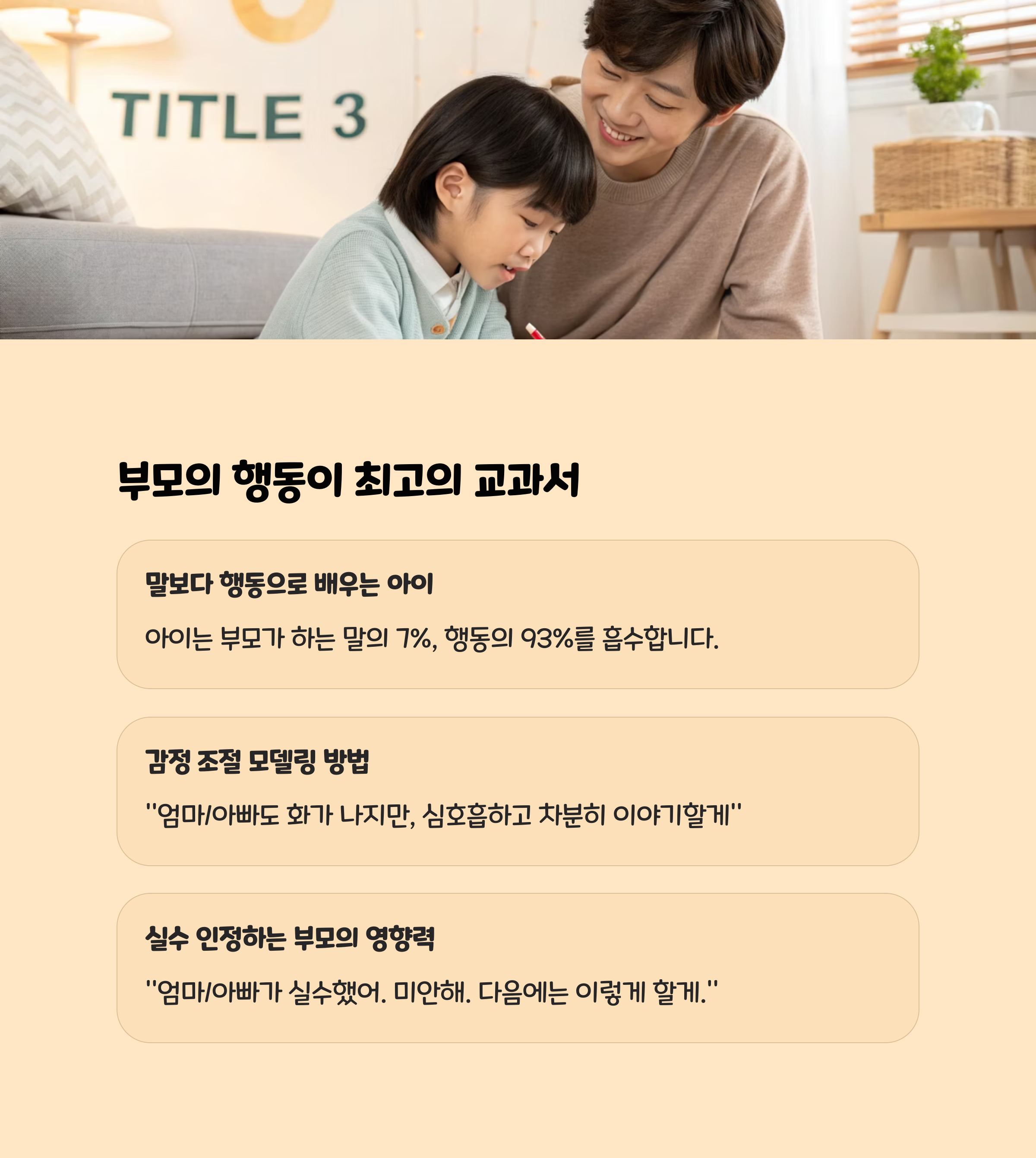 아이들은 부모의 행동을 따라 합니다. 부모가 약속을 지키고, 감정을 조절하는 모습을 보여주면, 아이도 자연스럽게 배웁니다.