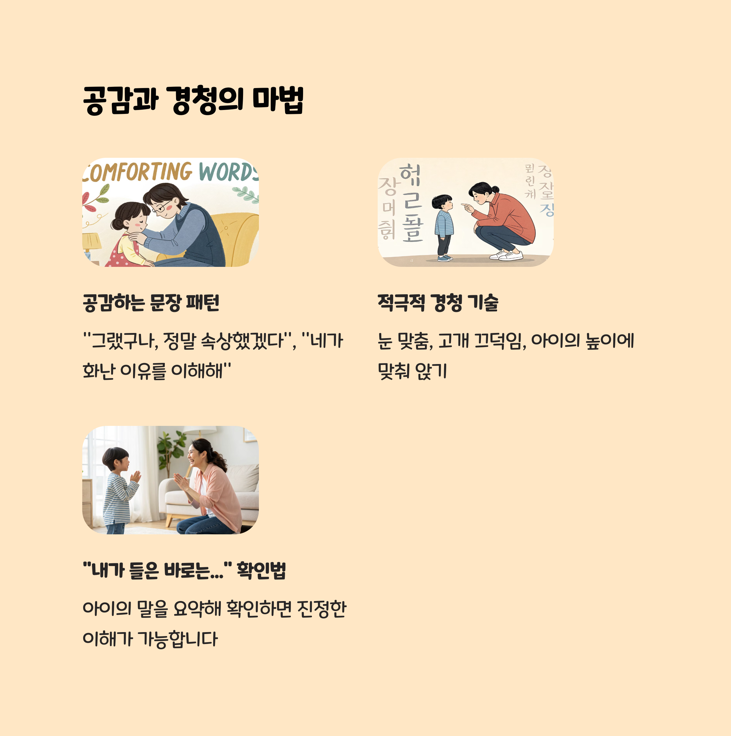 아이의 행동에는 나름의 이유가 있습니다. “왜 그렇게 했는지”를 물어보고, 아이가 자신의 감정을 말할 수 있도록 도와주세요. 아이의 입장을 존중하면, 아이도 부모의 말을 더 잘 받아들입니다.