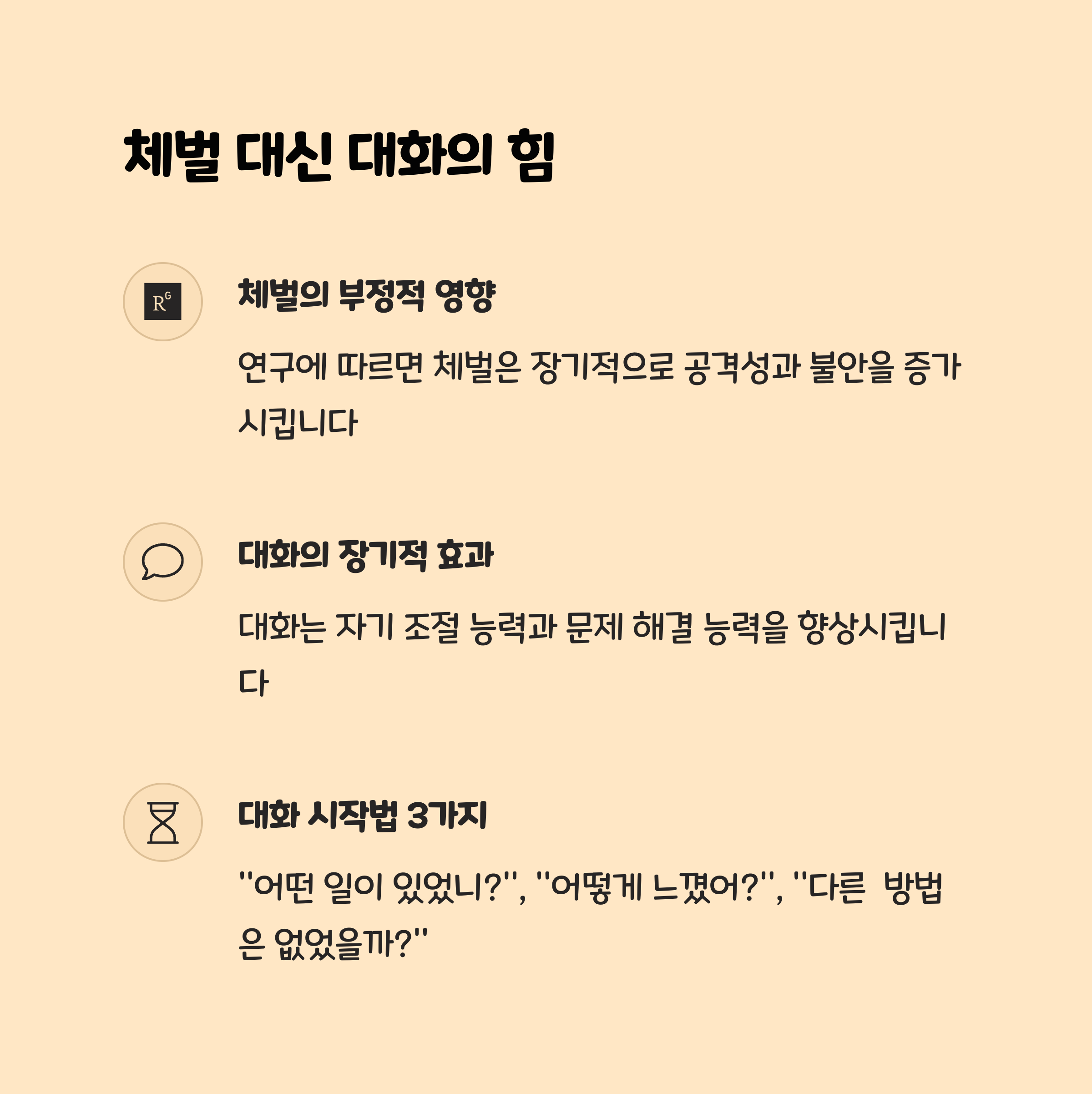 물리적 힘이나 위협은 단기적으로 효과가 있는 것처럼 보여도, 장기적으로는 아이의 자존감에 큰 상처를 남깁니다. 체벌 대신 대화와 설명, 그리고 공감으로 접근하세요.