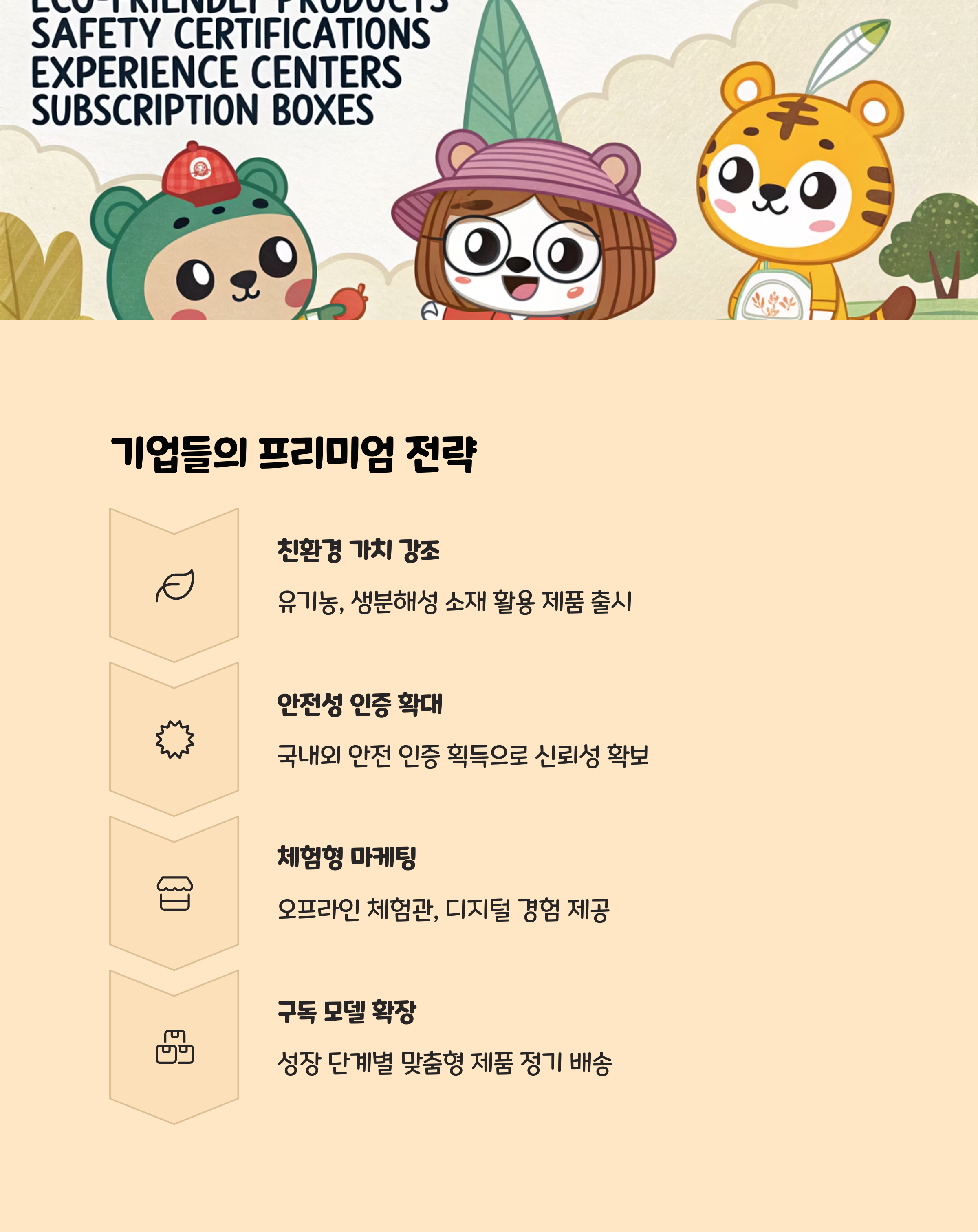 유기농, 비건 소재 인기 : 아가방앤컴퍼니는 유기농 의류 라인을 강화했고, 해피랜드는 프리미엄 전용 라인을 확대했습니다.