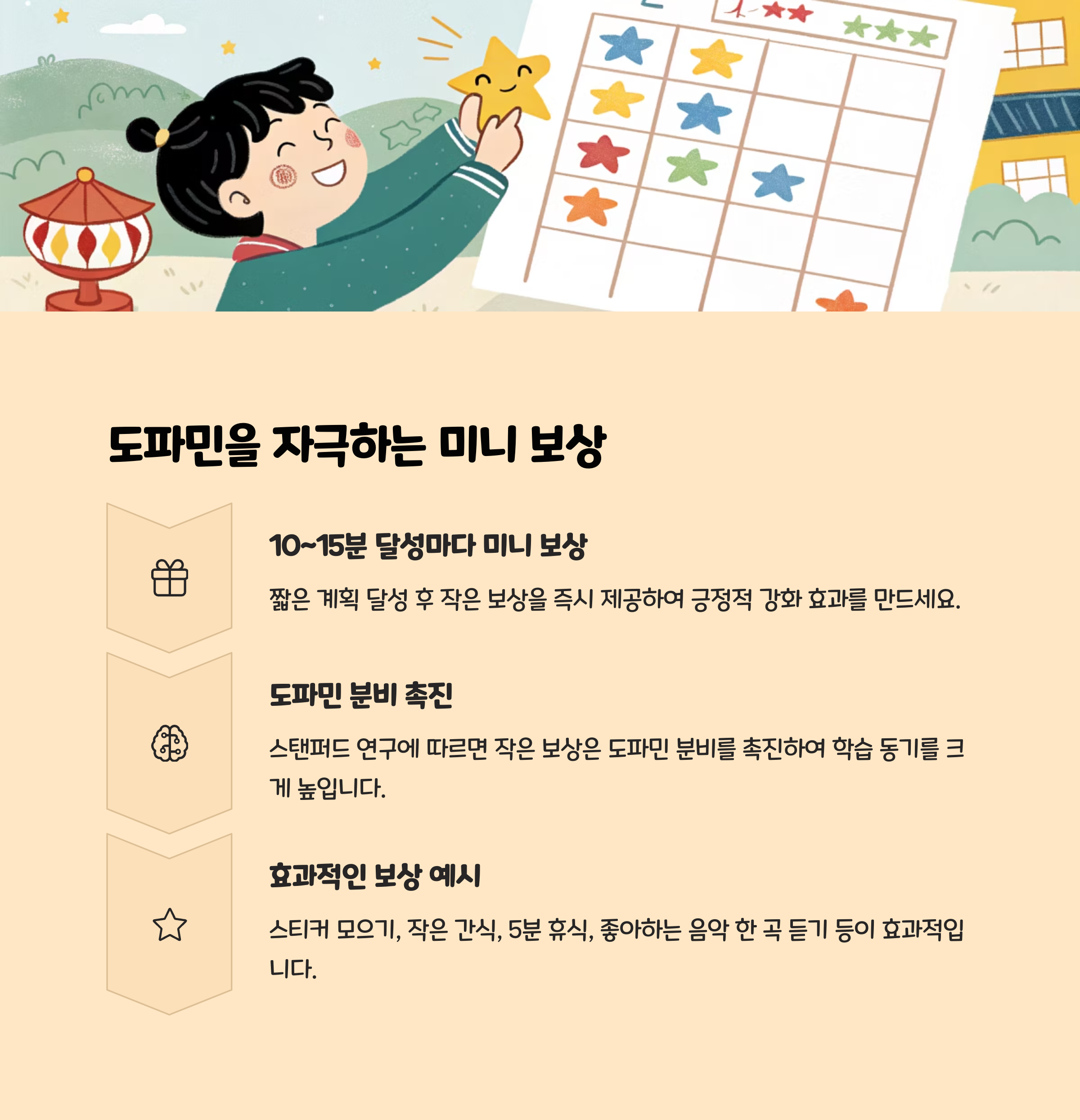 몰입하는 아이들은 행동과 결과를 연결하는 ‘빠른 보상’을 경험합니다. 예를 들어, 3세트 포모도로를 성공하면 칭찬이나 작은 자유시간, 도장 찍기 등 즉각적인 보상을 제공합니다. 이는 뇌에 긍정적 자극을 주어, 다음 루틴 실행의 동기로 작용합니다. 단, 과도하거나 무조건적인 보상은 오히려 역효과가 날 수 있으므로, 성취와 연결된 작은 보상을 반복적으로 제공하는 것이 효과적입니다.