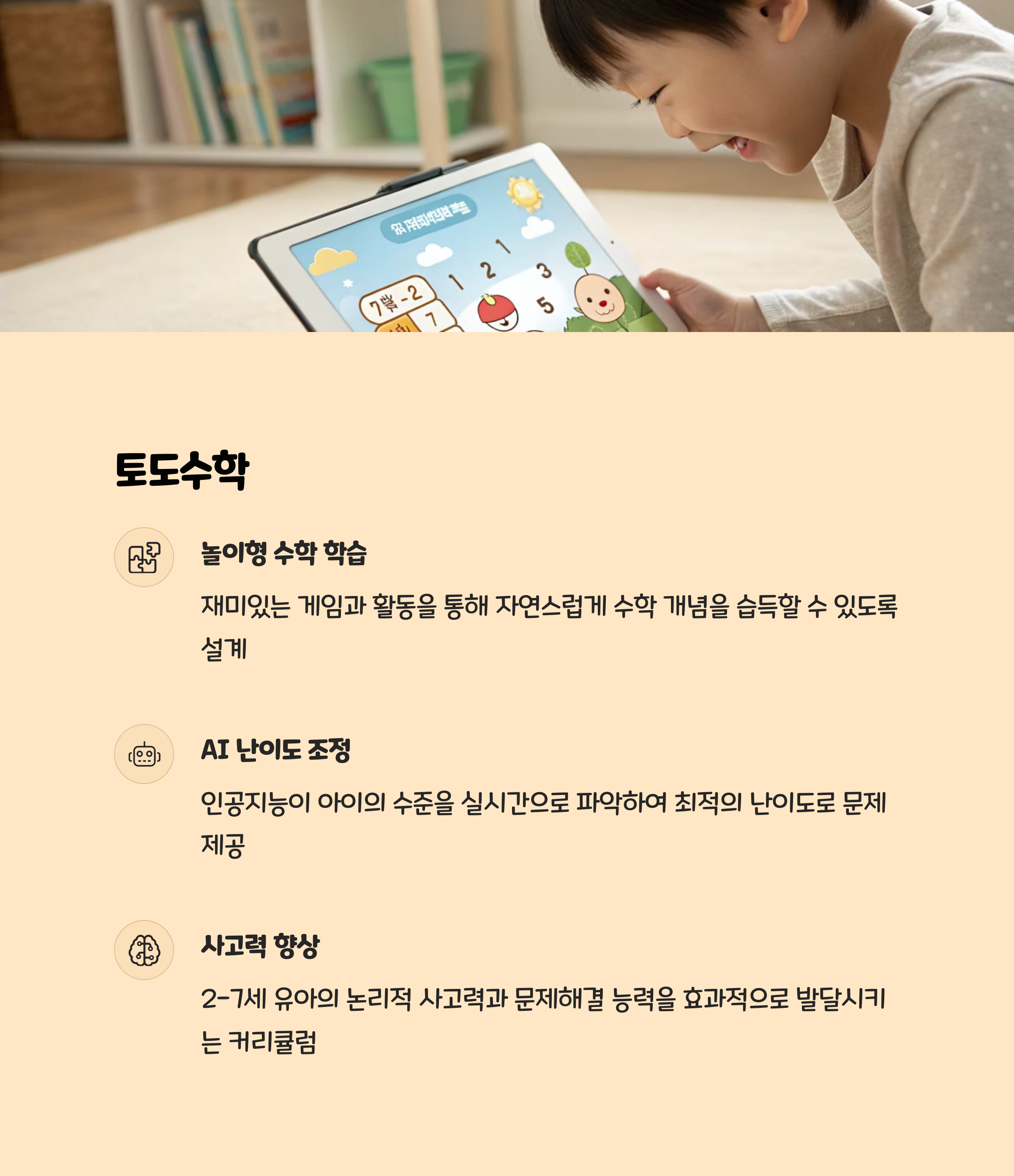 • 주요 특징 : 놀이형 수학 학습, AI 맞춤 난이도, 집중력 강화