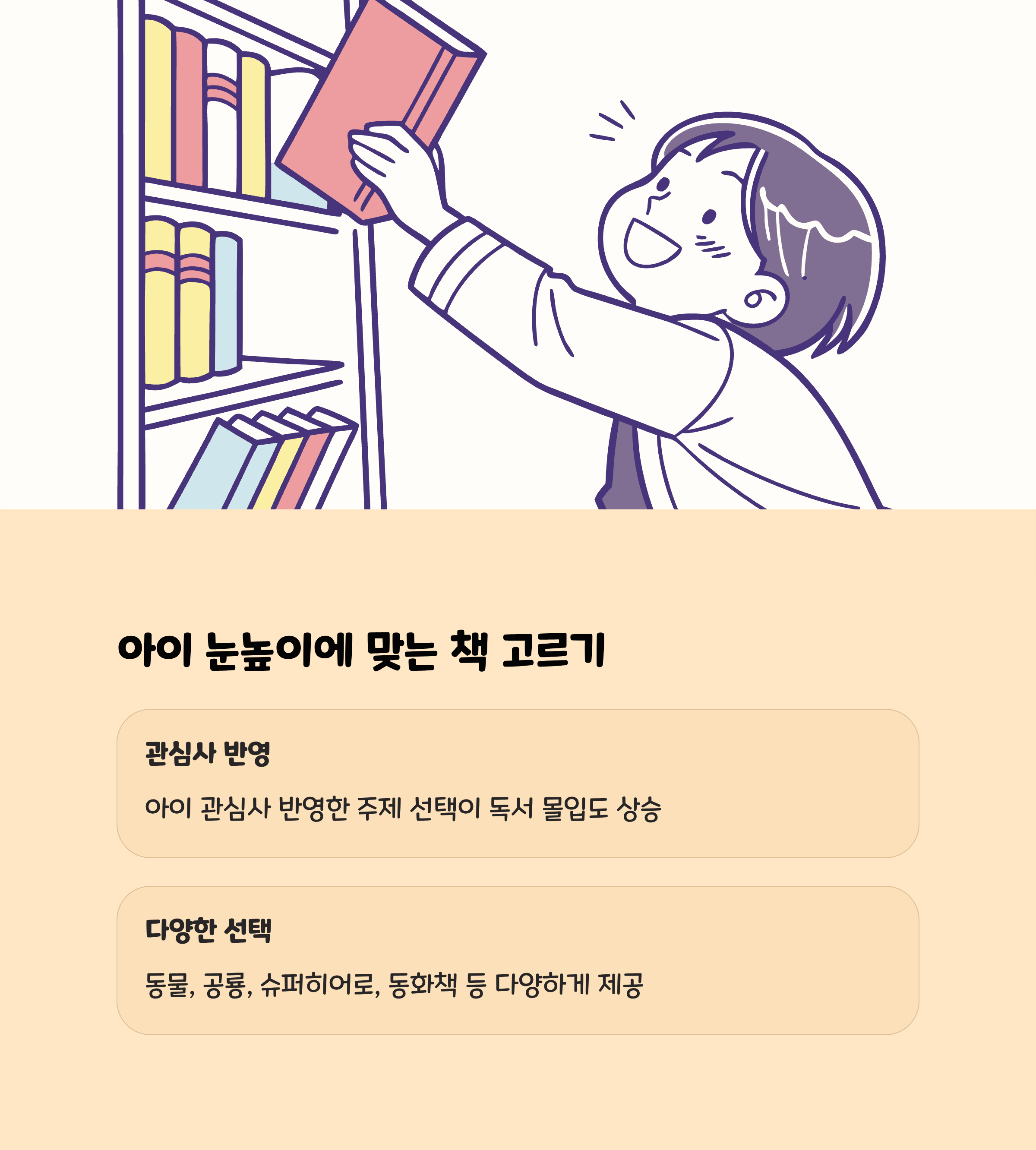| 책 고르기 | 아이와 함께 선택, 직접 고른 책으로 동기 부여 | 자율성 증대, 흥미 유발 |