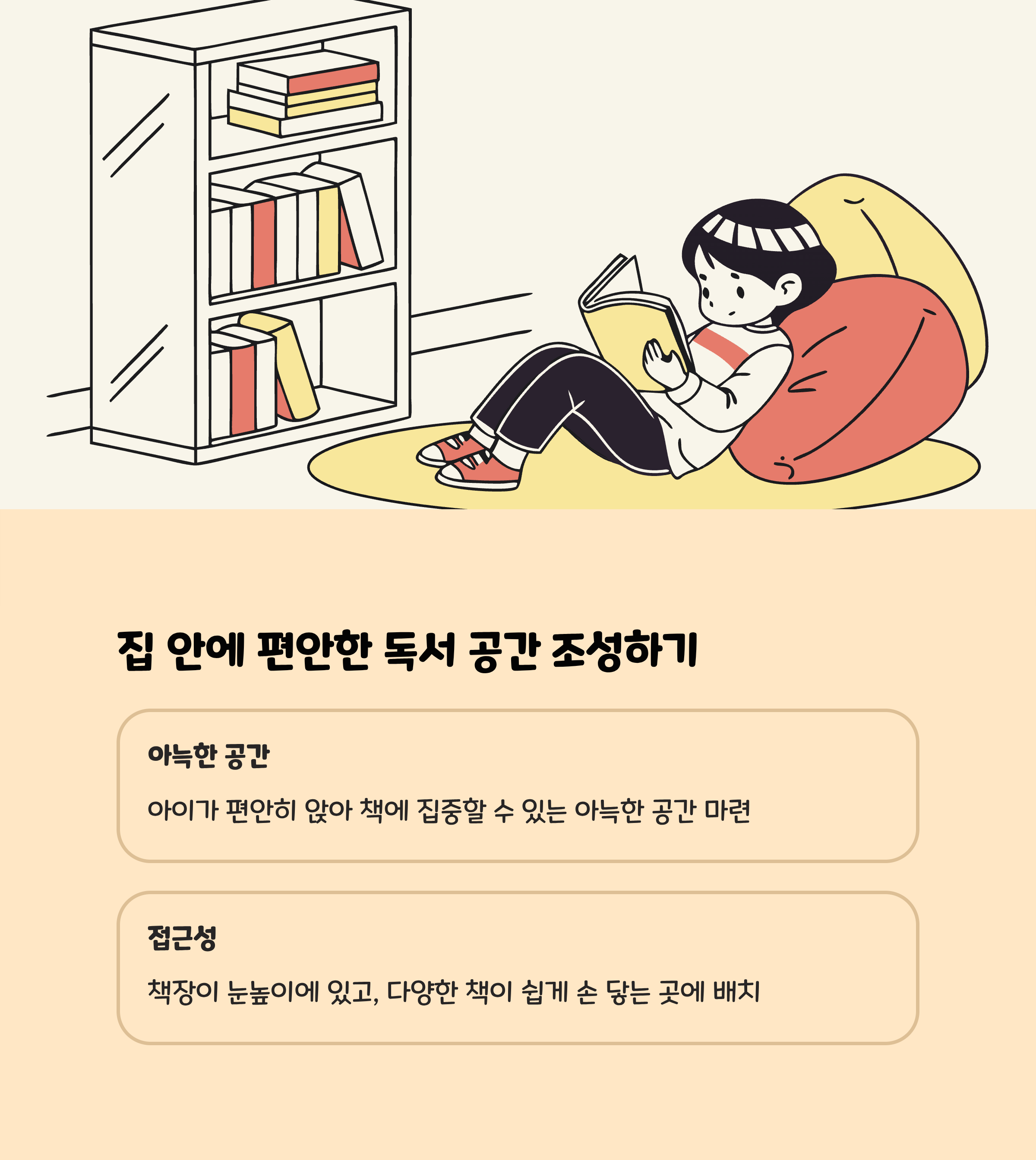 조용하고 편안한 독서 공간 마련, 적절한 조명과 온도 유지- 가족 모두가 참여하는 독서 시간 계획, 가족 캘린더에 독서 시간 포함
