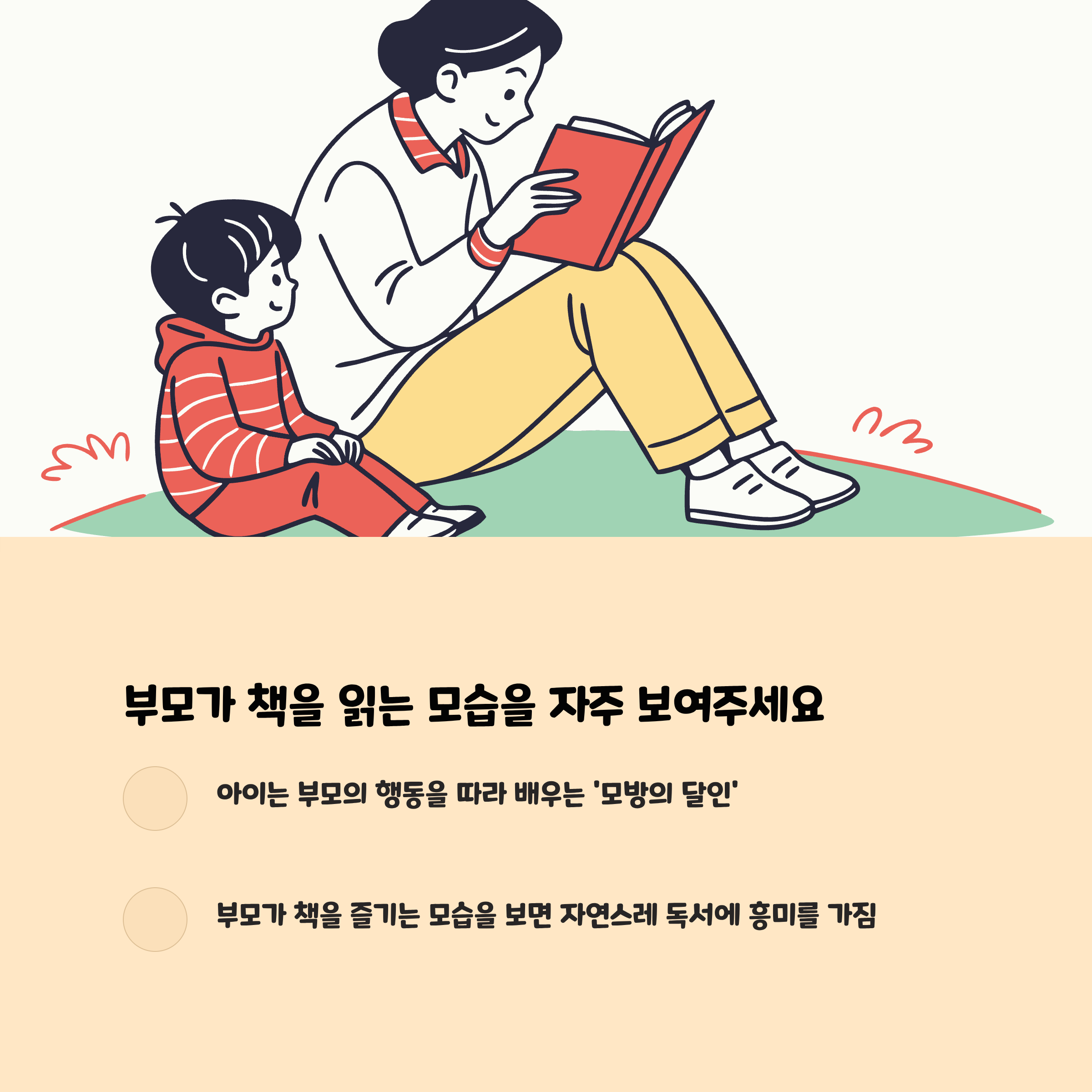| 부모 역할 | 부모가 독서하는 모습 보이기, 함께 독서하기 | 본보기 제공, 독서 동기 부여 |