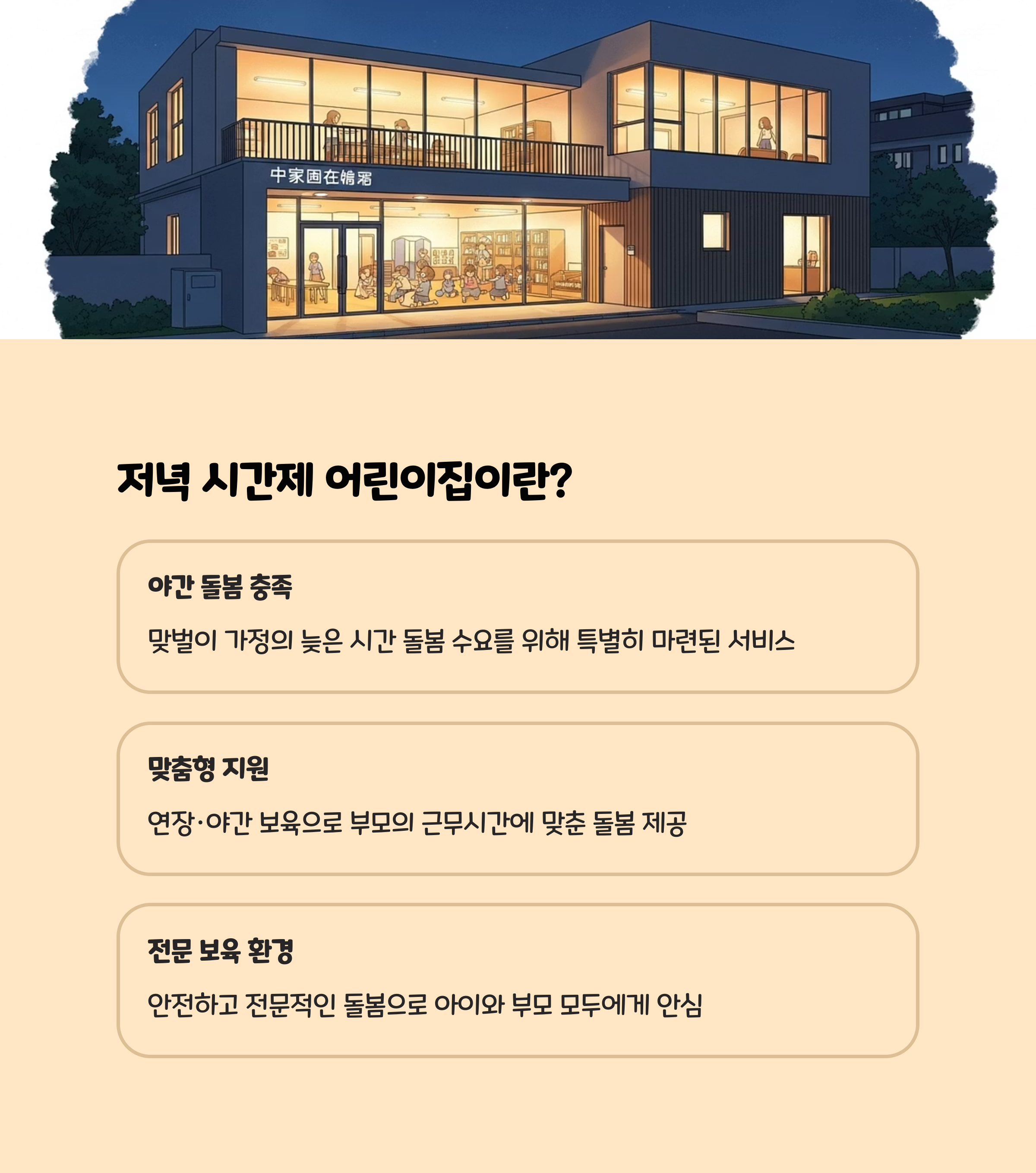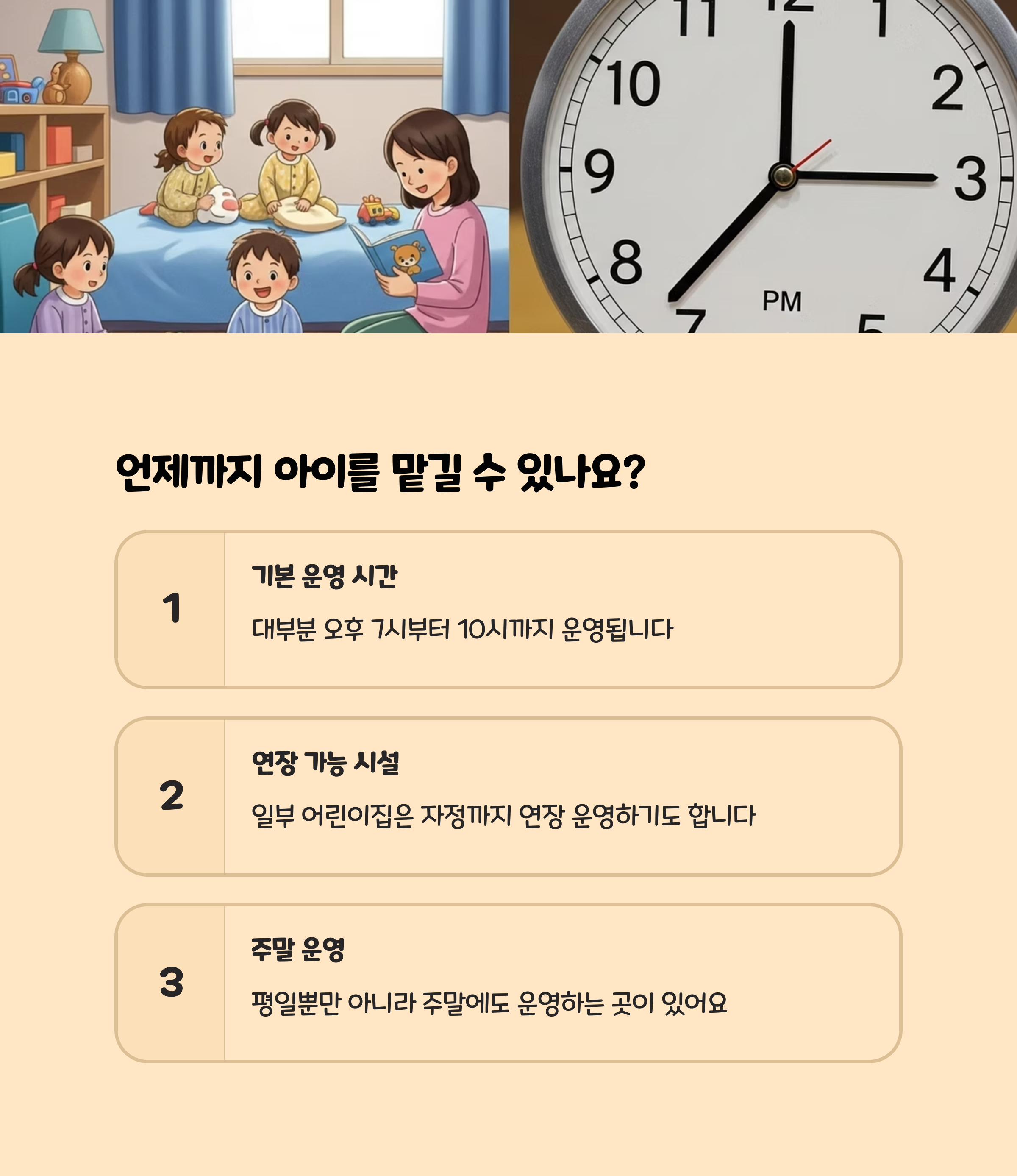 - 야간연장보육(평일 최대 22시, 기관마다 상이)