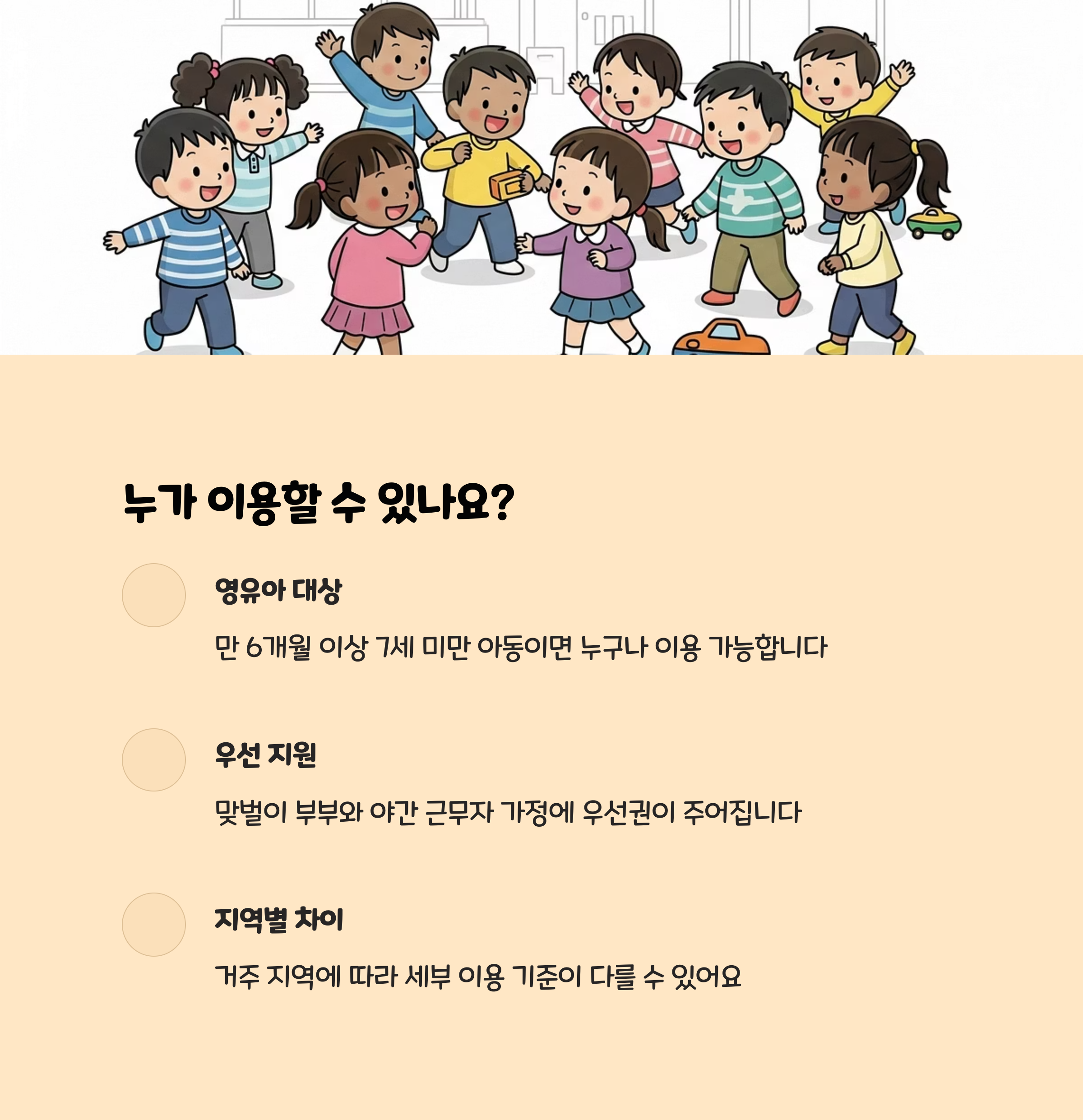 - 정규 어린이집을 다니지 않거나 연장 보육이 필요한 가정, 맞벌이·한부모·다자녀·취약계층 등 모두 이용 가능