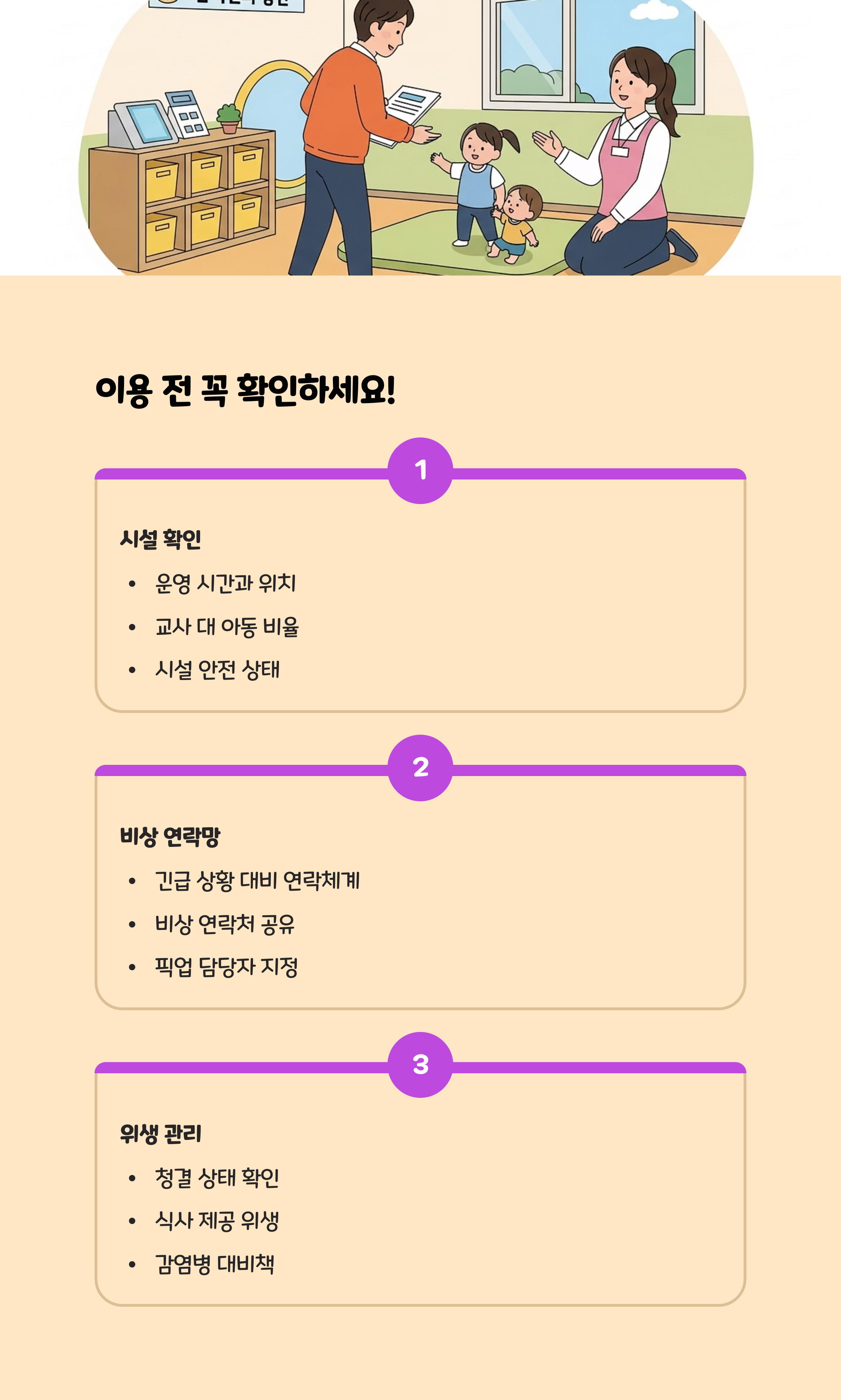 - 시설별 돌봄 내용, 식사/간식, CCTV, 교사진 배치 등도 확인 권장