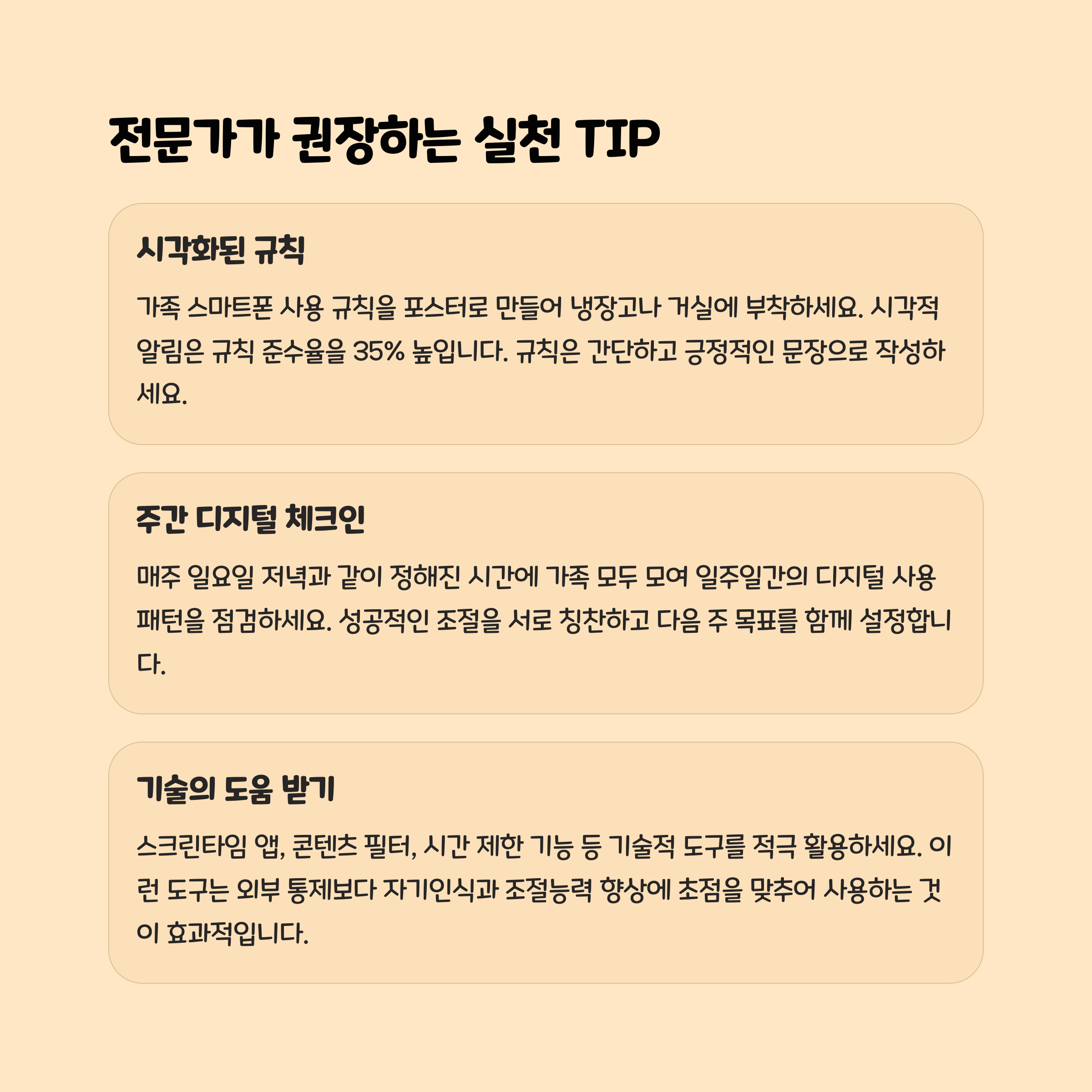 일방적으로 사용을 금지하거나 강제로 빼앗는 것은 오히려 반발심을 키울 수 있습니다. 자녀와 충분히 대화하여 스마트폰 사용의 필요성과 위험성을 함께 이야기하고, 사용 시간과 장소에 대한 규칙을 함께 정하세요. 예를 들어 “숙제와 집안일을 마친 뒤 30분간만 사용하기”, “잠자기 1시간 전에는 스마트폰 사용 금지” 등 구체적인 규칙을 세웁니다. 규칙을 잘 지키면 칭찬이나 소소한 보상을 제공해 동기를 부여하는 것도 효과적입니다.