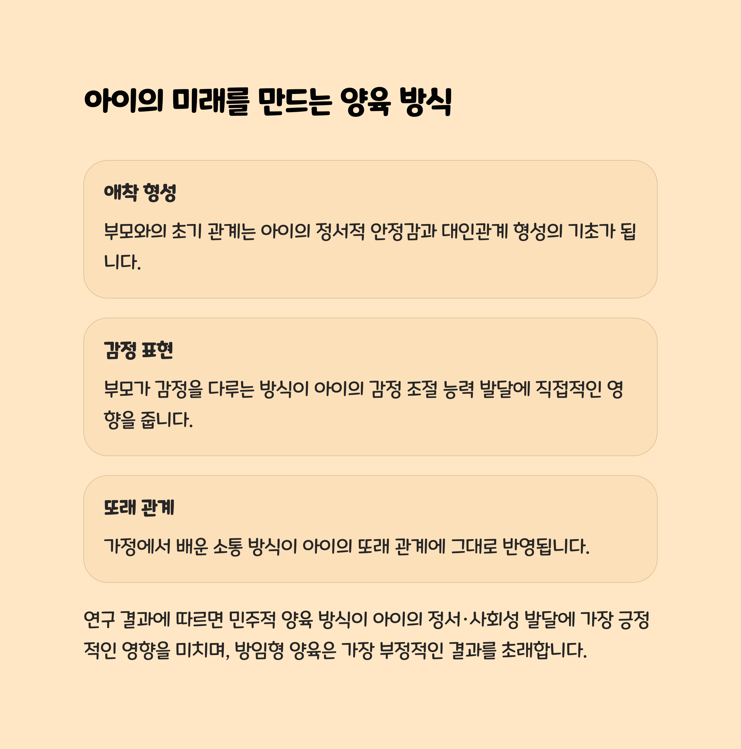 실제로 독재적 양육을 받은 아이는 낮은 자존감, 불안, 분노조절 문제를 겪기 쉽고, 허용적 양육은 자기중심적 행동과 규칙 준수의 어려움, 방임적 양육은 정서불안과 사회성 결핍으로 이어질 수 있습니다.