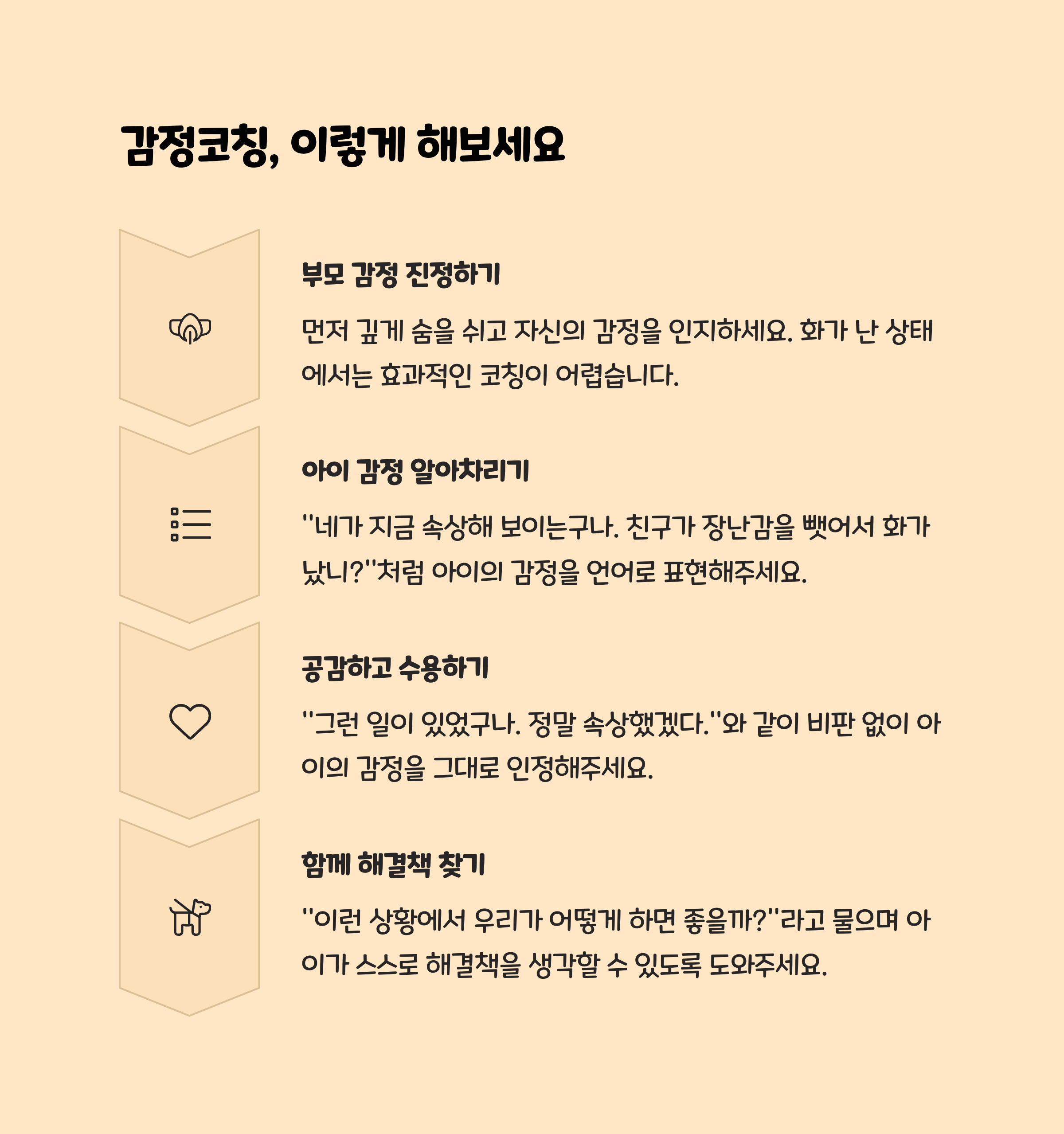 - 감정 조절과 일관성 유지 : 부모의 감정 상태가 아이에게 직접적으로 영향을 미치므로, 스트레스 관리와 자기 조절이 중요합니다.