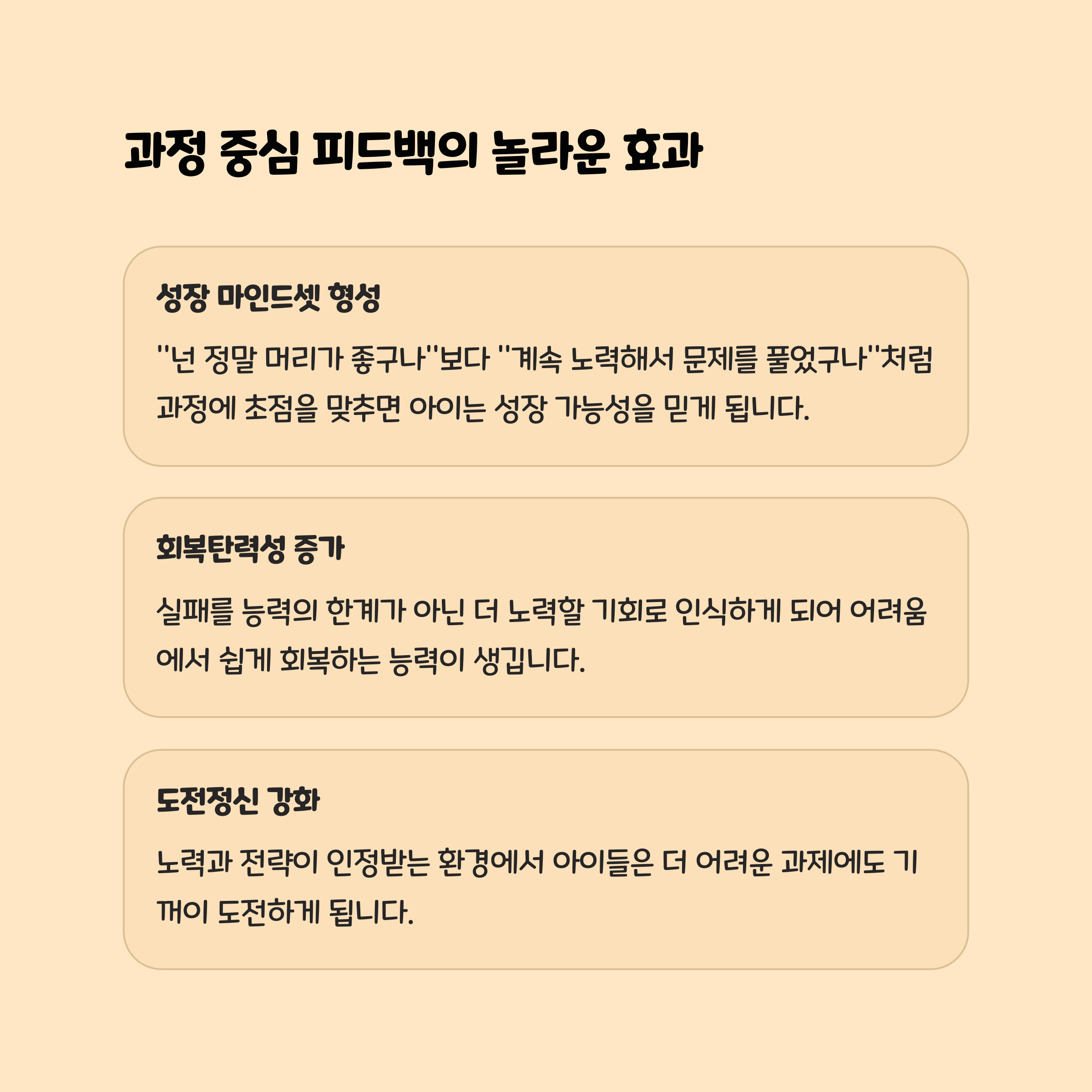- 적절한 격려와 피드백 : 결과가 아닌 과정에 초점을 맞춘 칭찬과, 실수에 대한 건설적 피드백을 제공하세요.