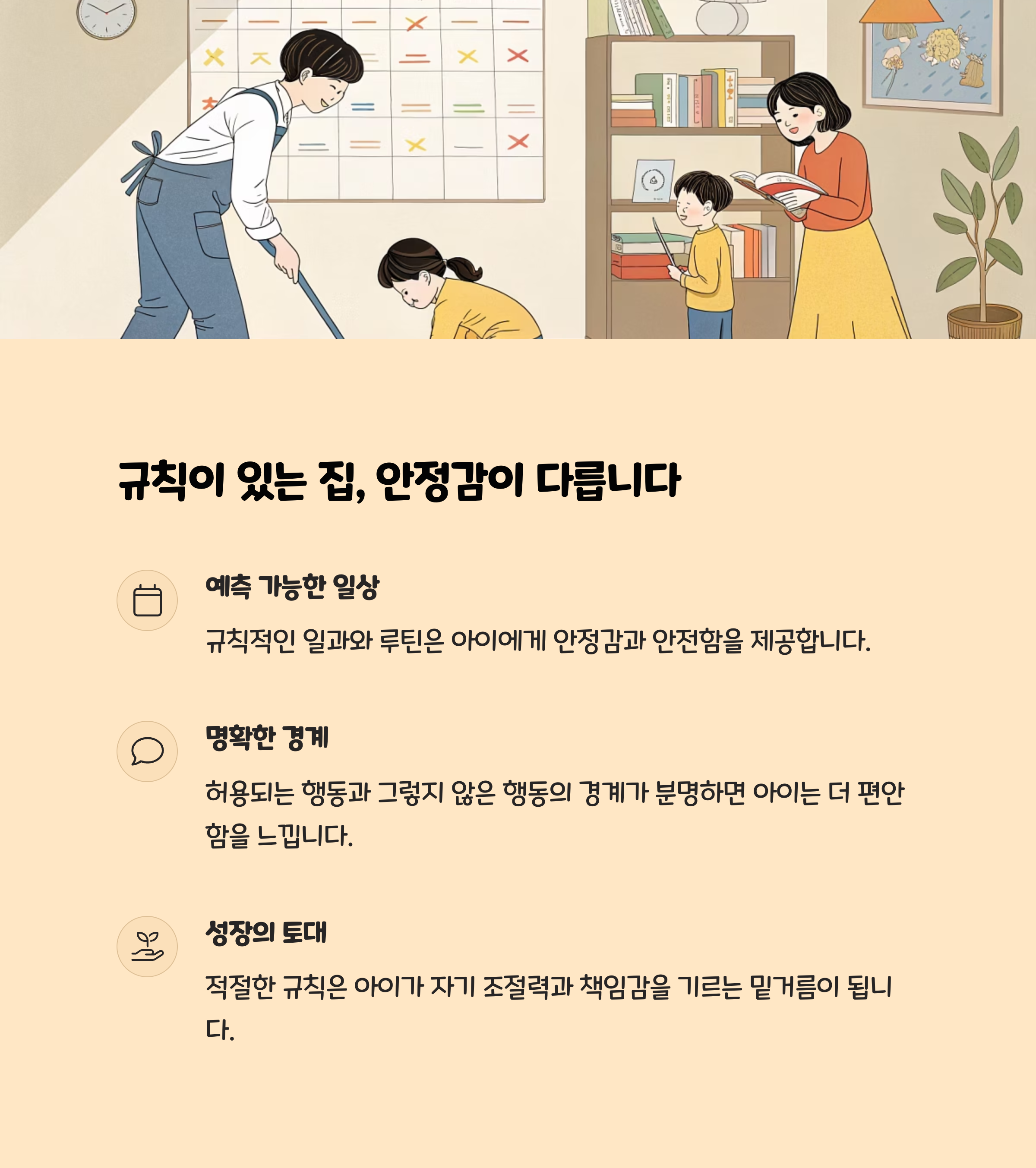 - 상황에 맞는 규칙 설정 : 가정의 가치에 따라 꼭 필요한 규칙만 정하고, 아이와 함께 결정하세요.