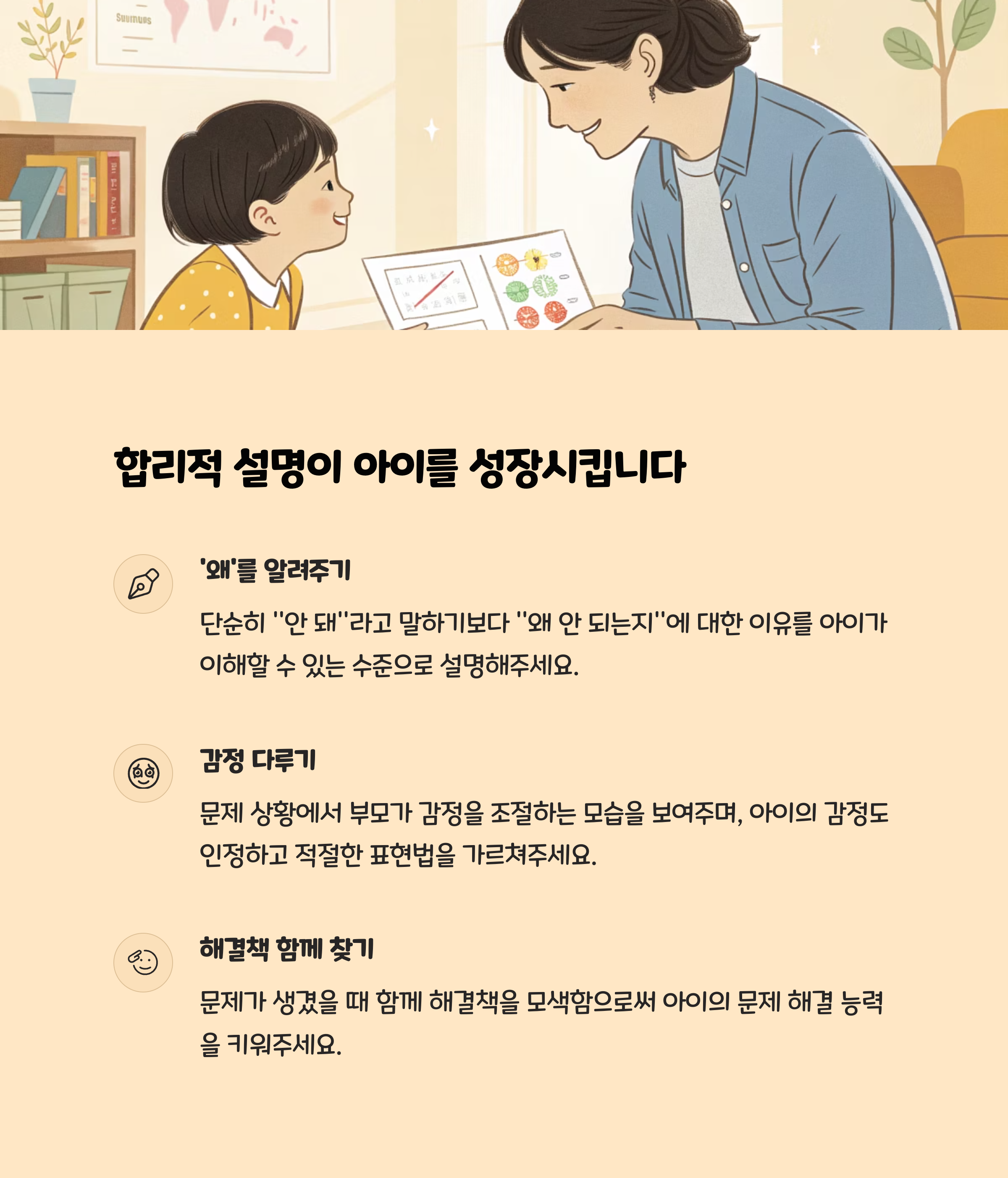 - 합리적 설명과 대화 : 아이가 이해할 수 있도록 이유를 설명하고, 의견을 나누는 습관을 들이세요.