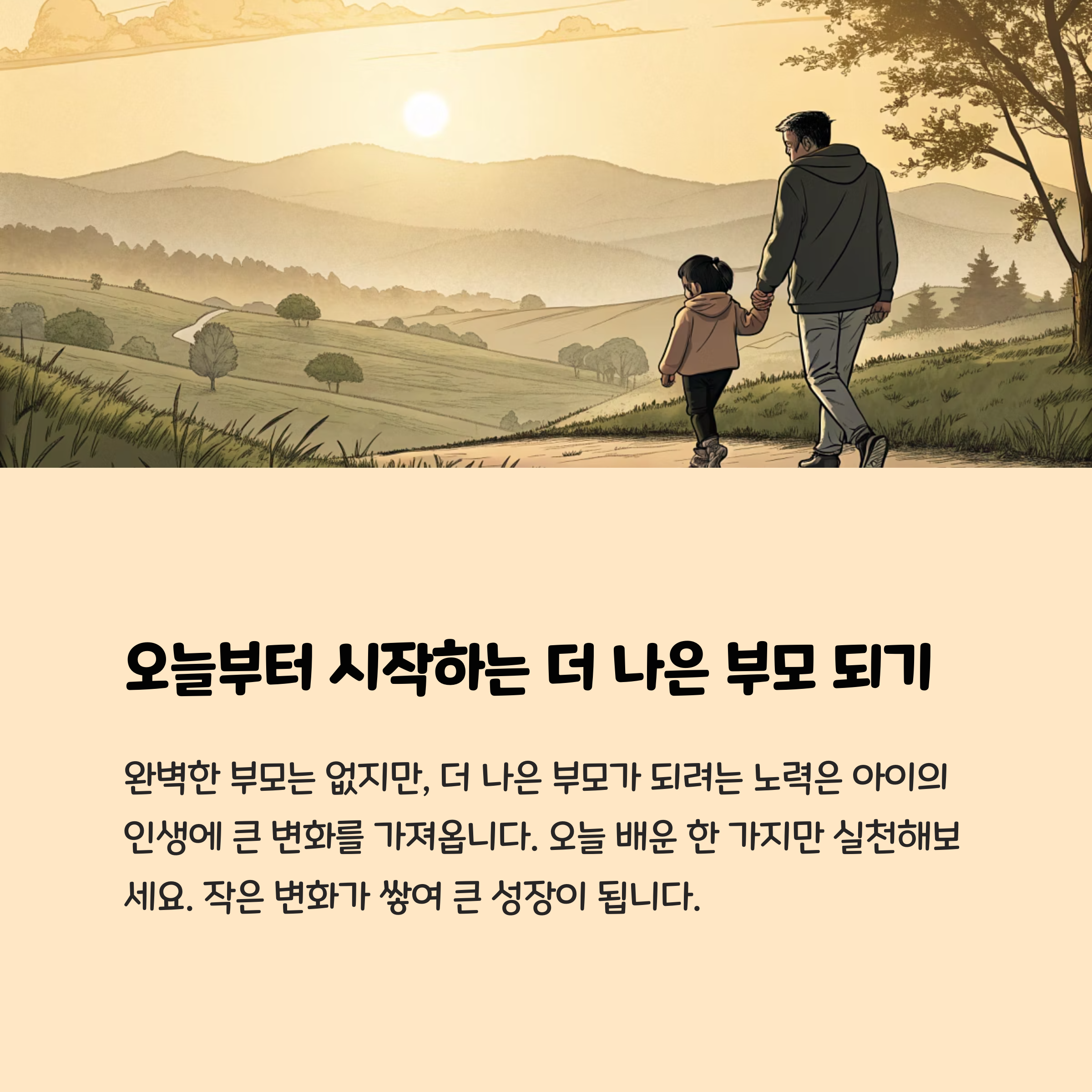 완벽한 부모란 존재하지 않습니다. 중요한 것은 실수를 인정하고, 더 나은 부모가 되기 위해 배우고 성장하려는 마음가짐입니다. 아이와 함께 성장한다는 생각으로, 자신의 양육태도를 점검하고 개선해 나가면 충분히 좋은 부모가 될 수 있습니다.