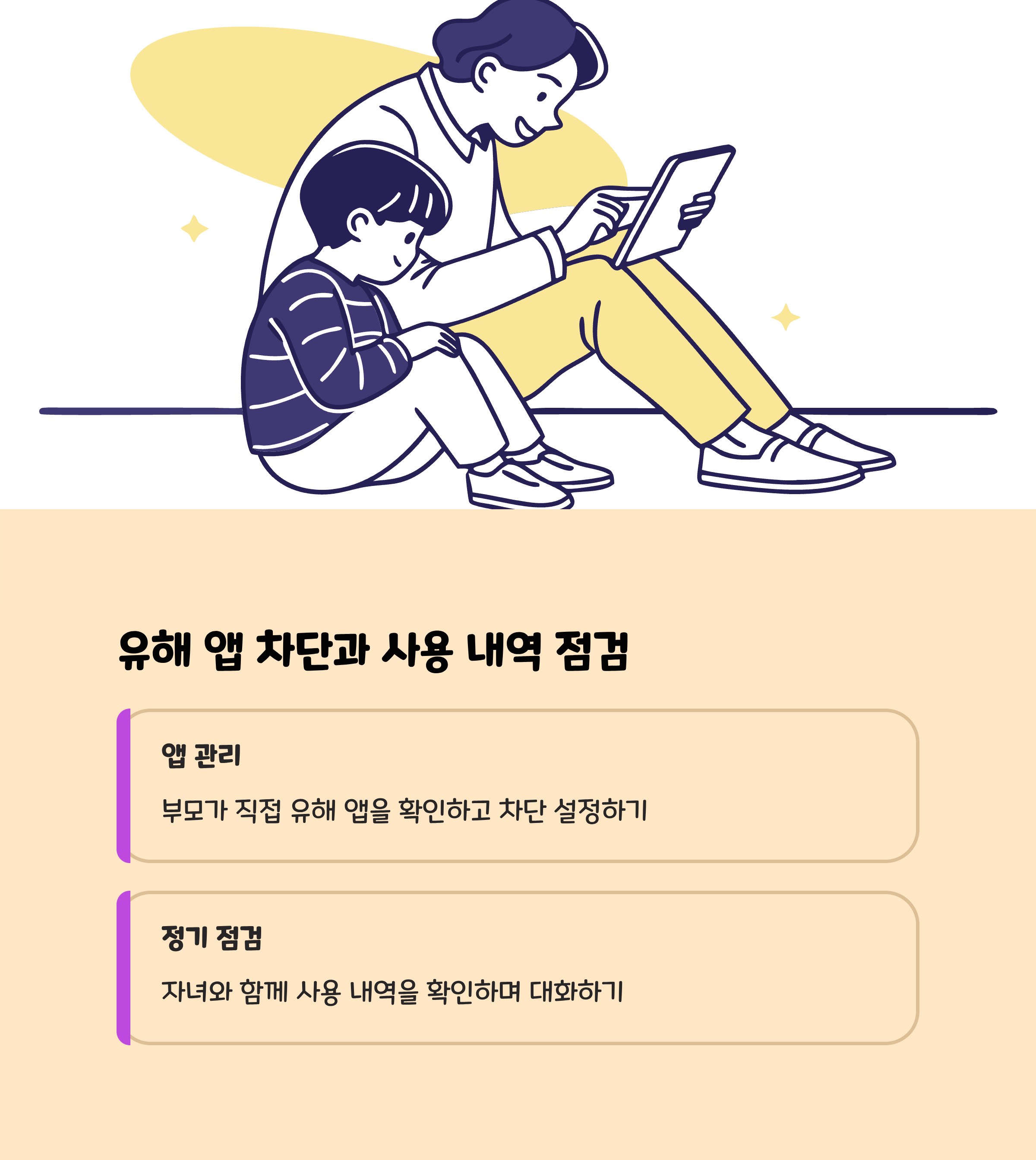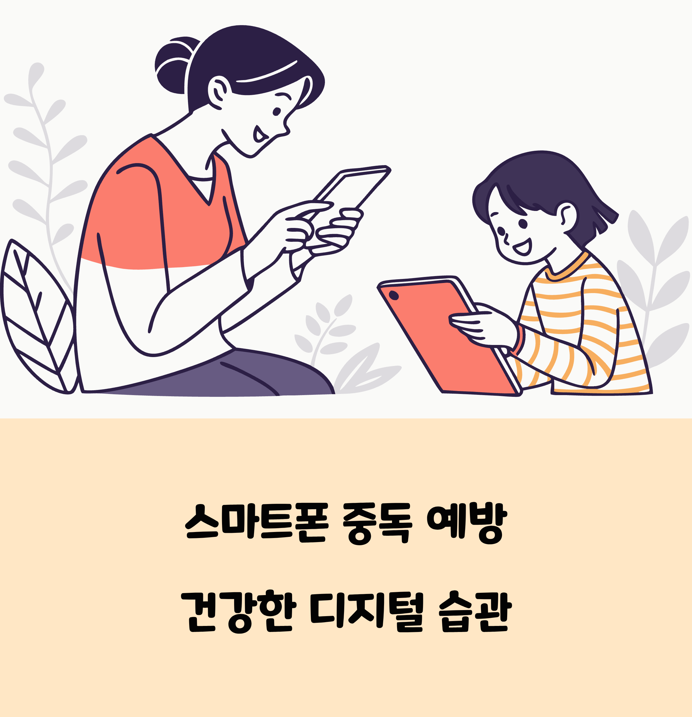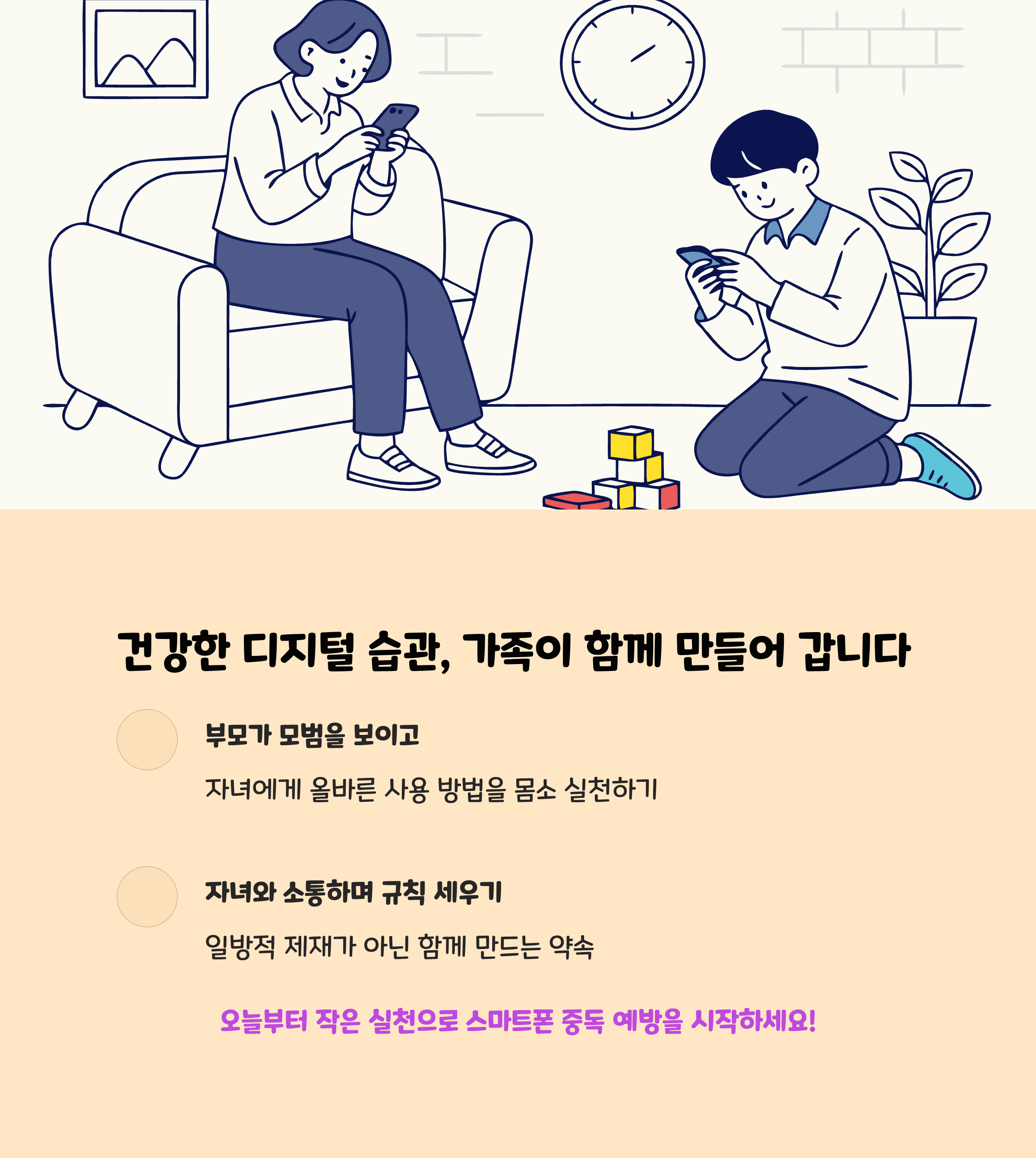 부모부터 솔선수범: 부모가 먼저 스마트폰 사용 시간을 줄이고 올바른 사용 습관을 보여주세요.함께 정하는 규칙: 가족회의를 통해 스마트폰 사용 시간, 사용 장소, 허용 앱 등을 함께 상의하며 약속을 만듭니다.- 약속 위반 시 함께 합의한 벌칙 적용이 중요합니다.