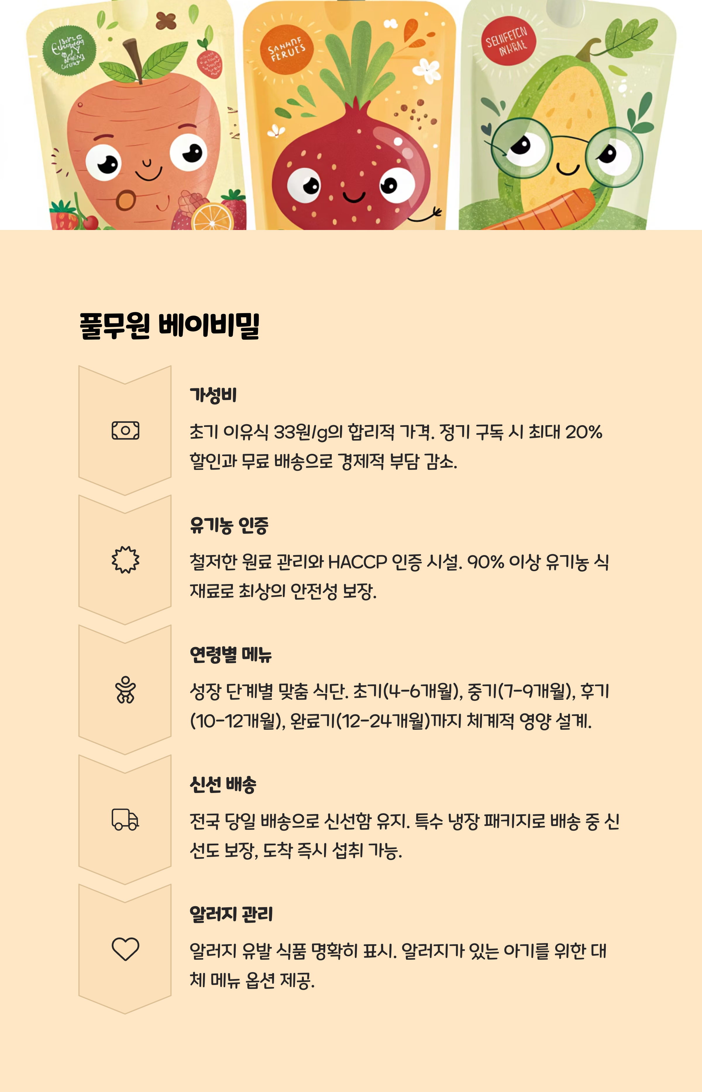 주요 강점: 국산 농산물, 알레르기 정보 체계적 제공, 전문 연구진 영양설계가격대: 2,900~3,600원/팩배송: 신선 냉장 배송실사용 후기: “브랜드 신뢰도가 높아 안심”, “알레르기 정보가 체계적으로 제공되어 선택이 편리”추천 포인트: 체계적이고 과학적인 이유식을 원하는 가정.