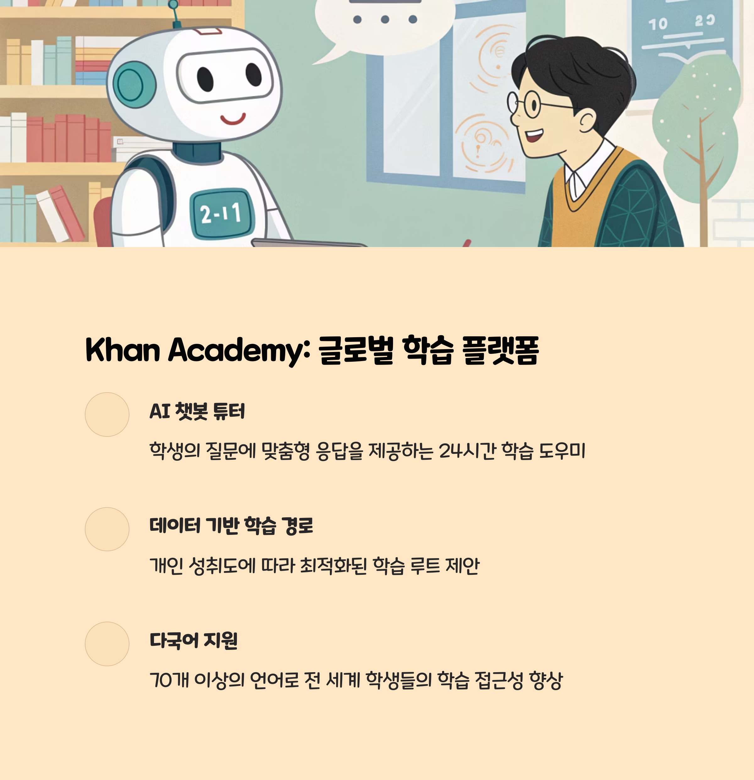 Khan Academy는 전 세계적으로 사랑받는 무료 개인화 학습 플랫폼입니다. 수학, 과학, 역사 등 다양한 과목의 동영상 강의와 함께, 실시간 채점과 해설이 제공되는 연습 문제를 제공합니다. AI 기반 분석으로 학생의 취약 영역을 파악해, 맞춤형 학습 경로를 안내합니다. 특히 ‘Khanmigo’라는 AI 튜터는 학생의 질문에 실시간으로 답변하고, 학습 방향을 제시해 줍니다.