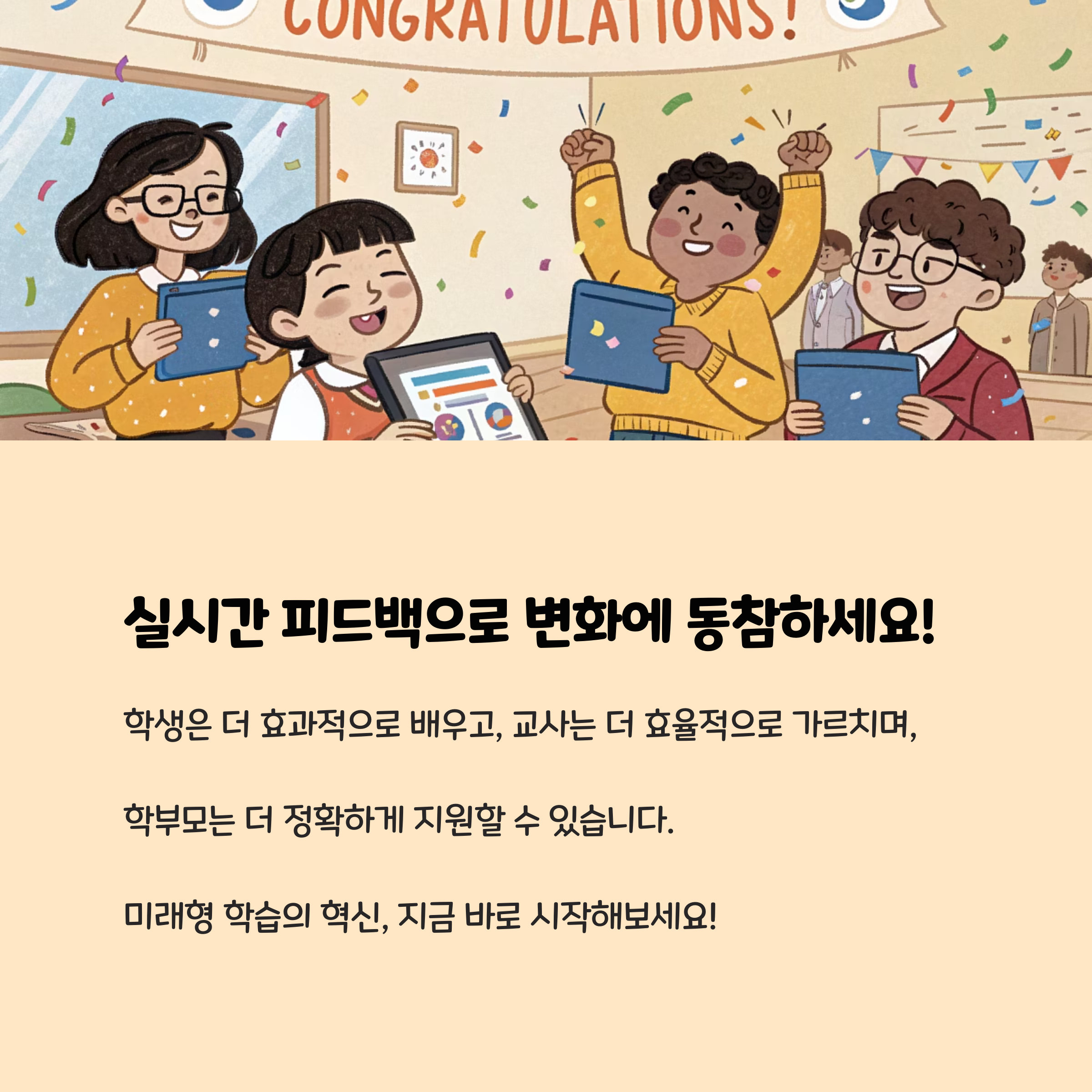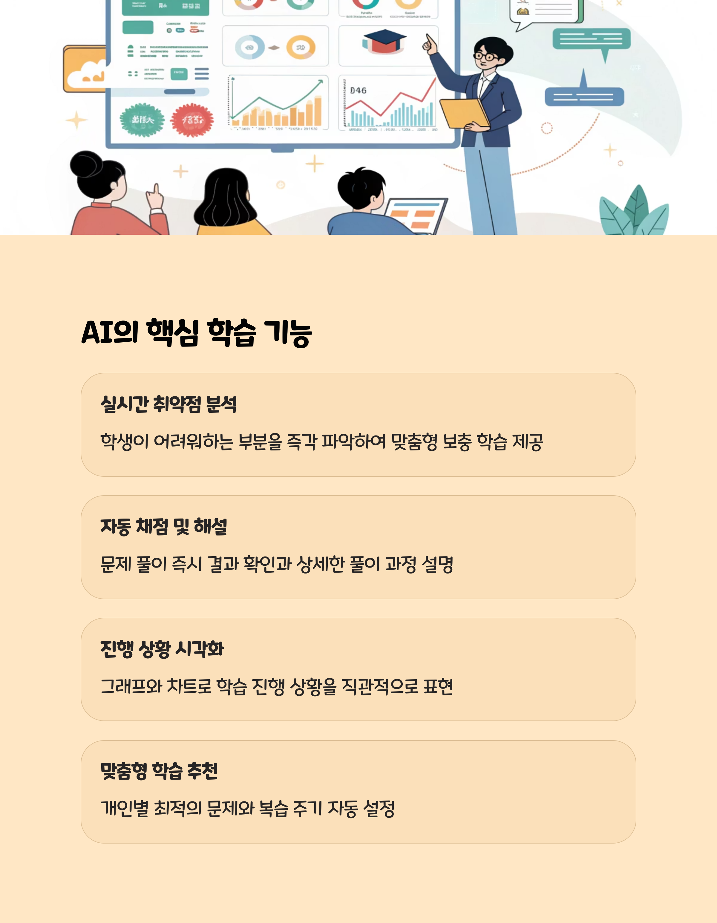 성적 향상: 41개 연구 분석 결과, 맞춤형 피드백 시스템 도입 시 59%의 학생이 성적이 향상되었습니다. 특히 STEM(과학, 기술, 공학, 수학) 분야에서 효과가 두드러집니다.참여도 증가: AI 기반 피드백 시스템을 도입한 학교에서는 과제 제출률이 34% 증가하고, 학습 동기와 만족도도 크게 높아졌습니다.즉각적 보완: 학생이 오답을 제출하면, 시스템이 즉시 해설과 추가 문제를 제시해 학습 공백을 최소화합니다. 교사는 실시간 데이터를 바탕으로 개별 상담, 소그룹 지도 등 맞춤형 지원이 가능합니다.