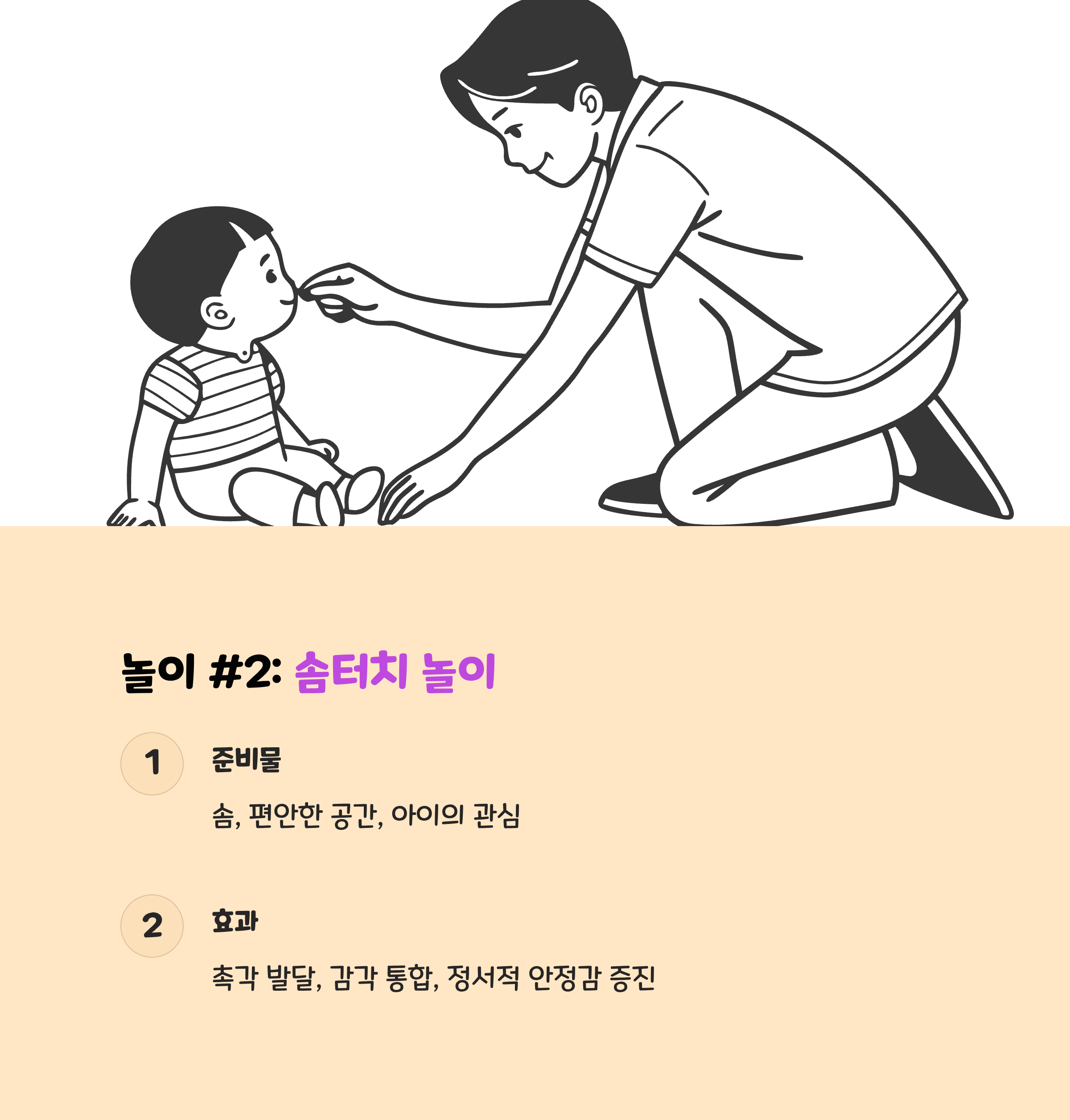 • 눈 맞춤과 피부 접촉은 아기에게 가장 강력한 안정감을 제공합니다. 매일 10~15분 이상의 놀이를 꾸준히 실천하면 신뢰감과 유대감이 깊어집니다.