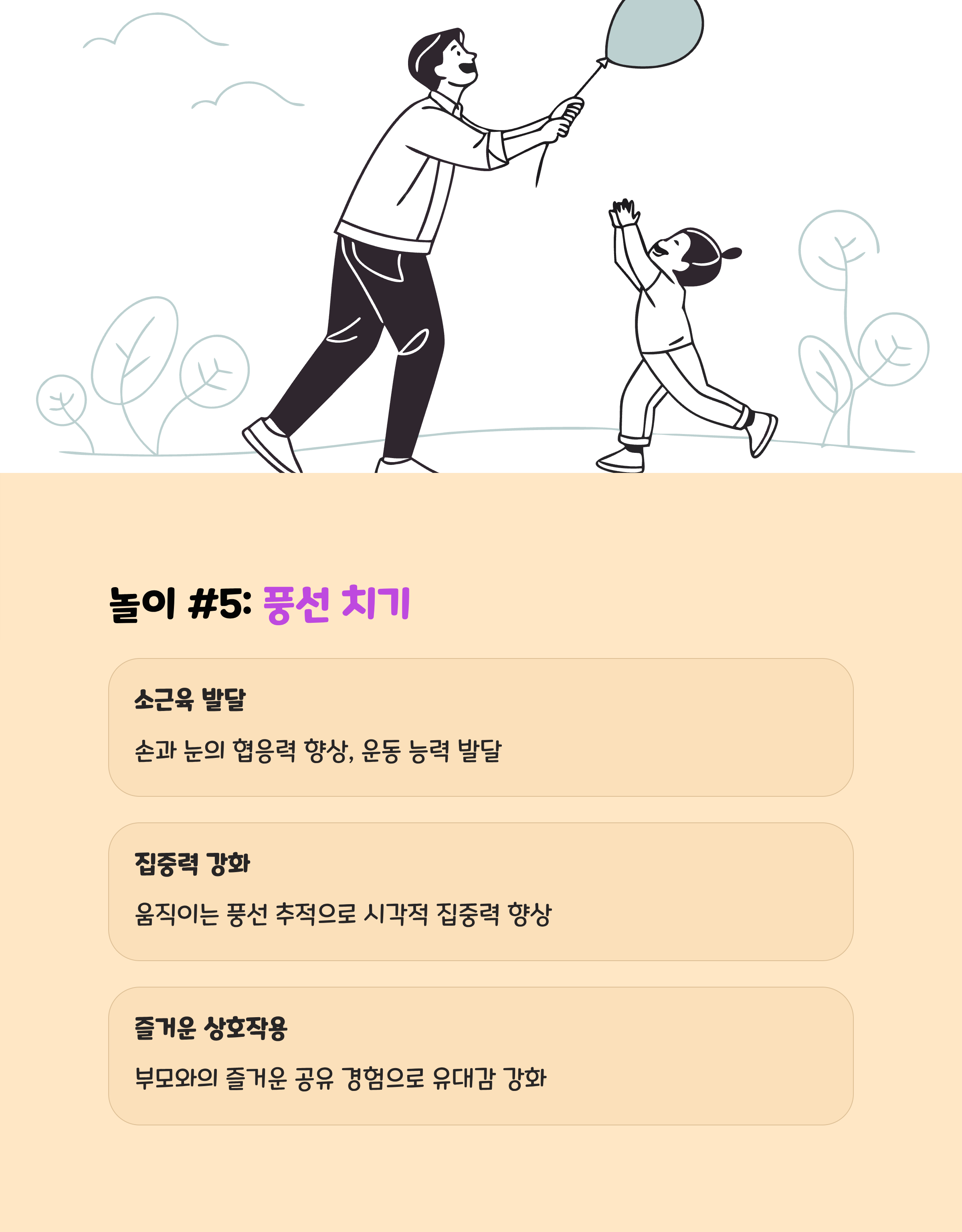 풍선이 바닥에 닿지 않게 주고받으며 뛰고 치는 놀이로 아이의 에너지 발산과 부모와의 상호작용 증진에 매우 효과적입니다.