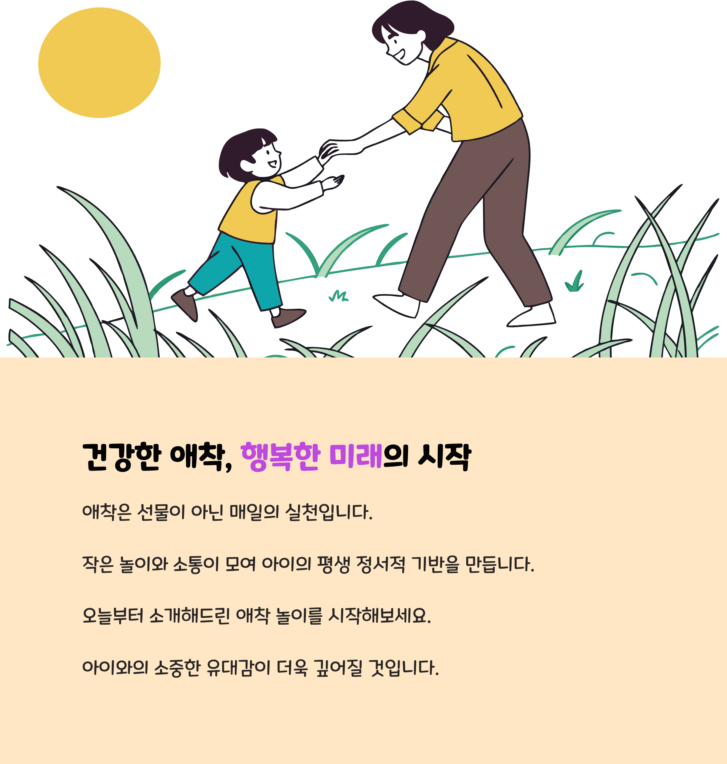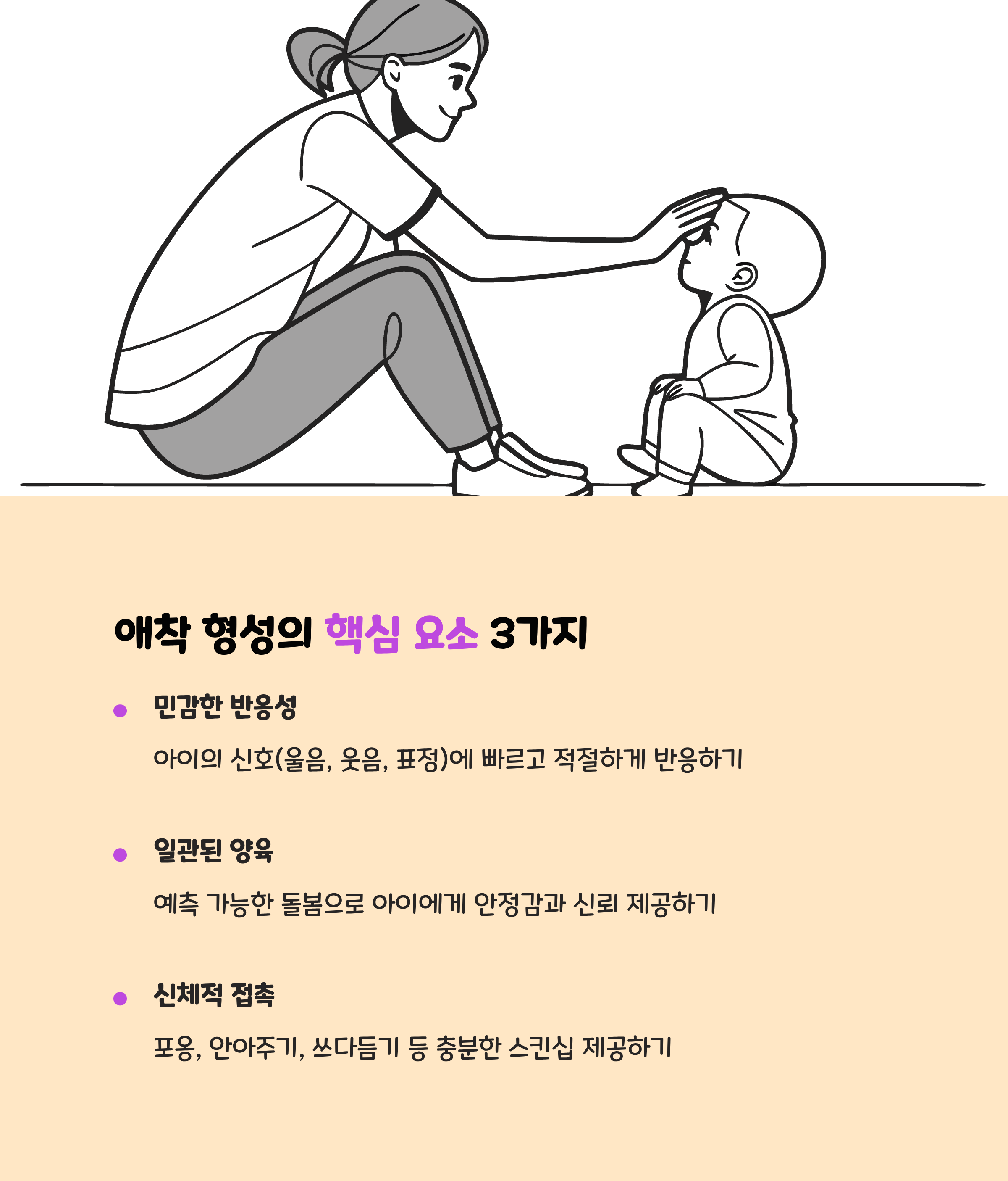 애착은 아기와 부모가 서로 신뢰를 쌓는 과정으로, 아이의 정서 안정과 사회성 발달의 기초입니다. 안정적인 애착이 형성되면 아이는 자신감을 갖고 건강한 성장에 도움을 받습니다.
