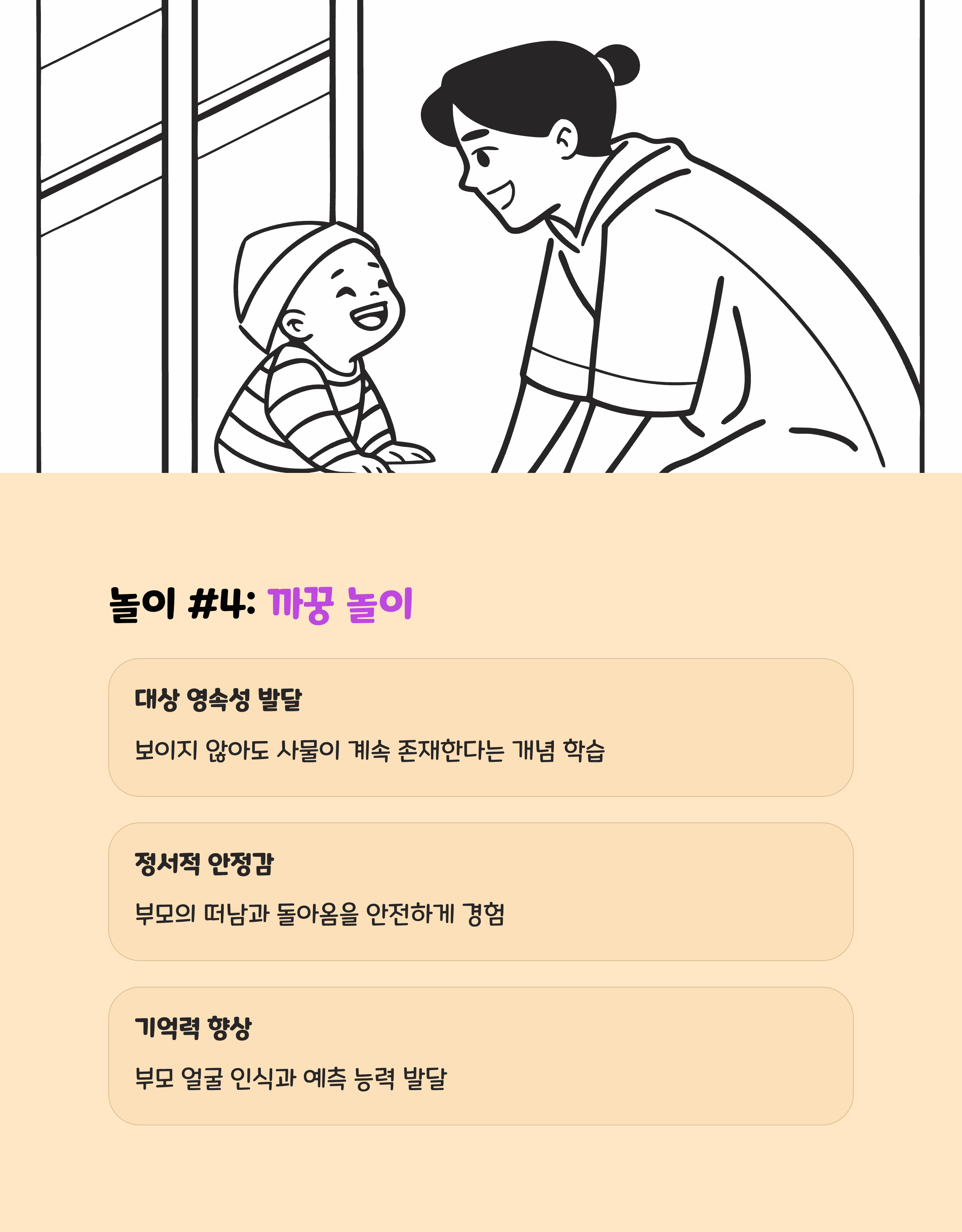 수건 등으로 얼굴을 가렸다가 '까~꿍!' 하며 나타나는 놀이는 아기의 대상 영속성 개념(사물이 눈에 보이지 않아도 존재한다는 이해)을 돕고, 정서적 안정에도 긍정적 영향을 줍니다.