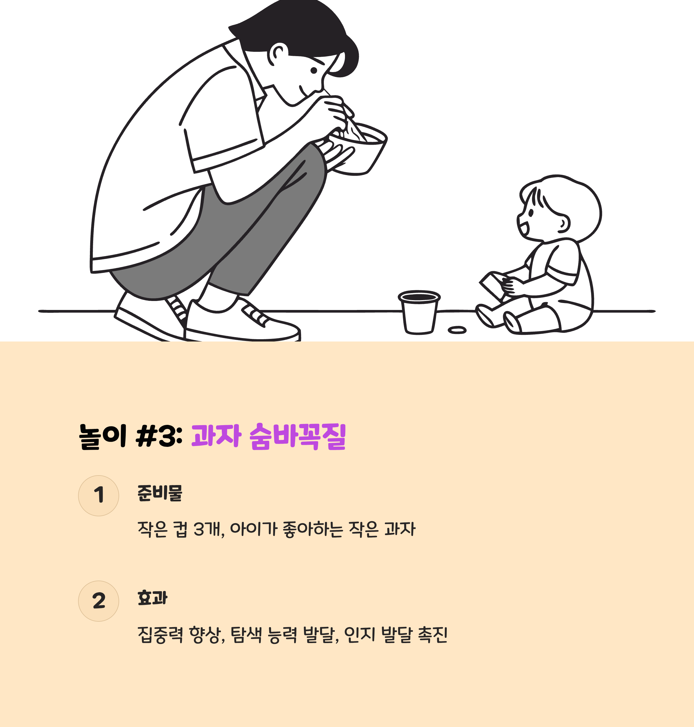 작은 과자 3~4개를 은박지에 싸 엄마 옷소매나 주머니에 숨겨 두고, 아기가 숨겨진 과자를 찾아내도록 해주세요. 이 과정에서 자연스러운 스킨십과 소근육 협응 능력이 함께 발달합니다.