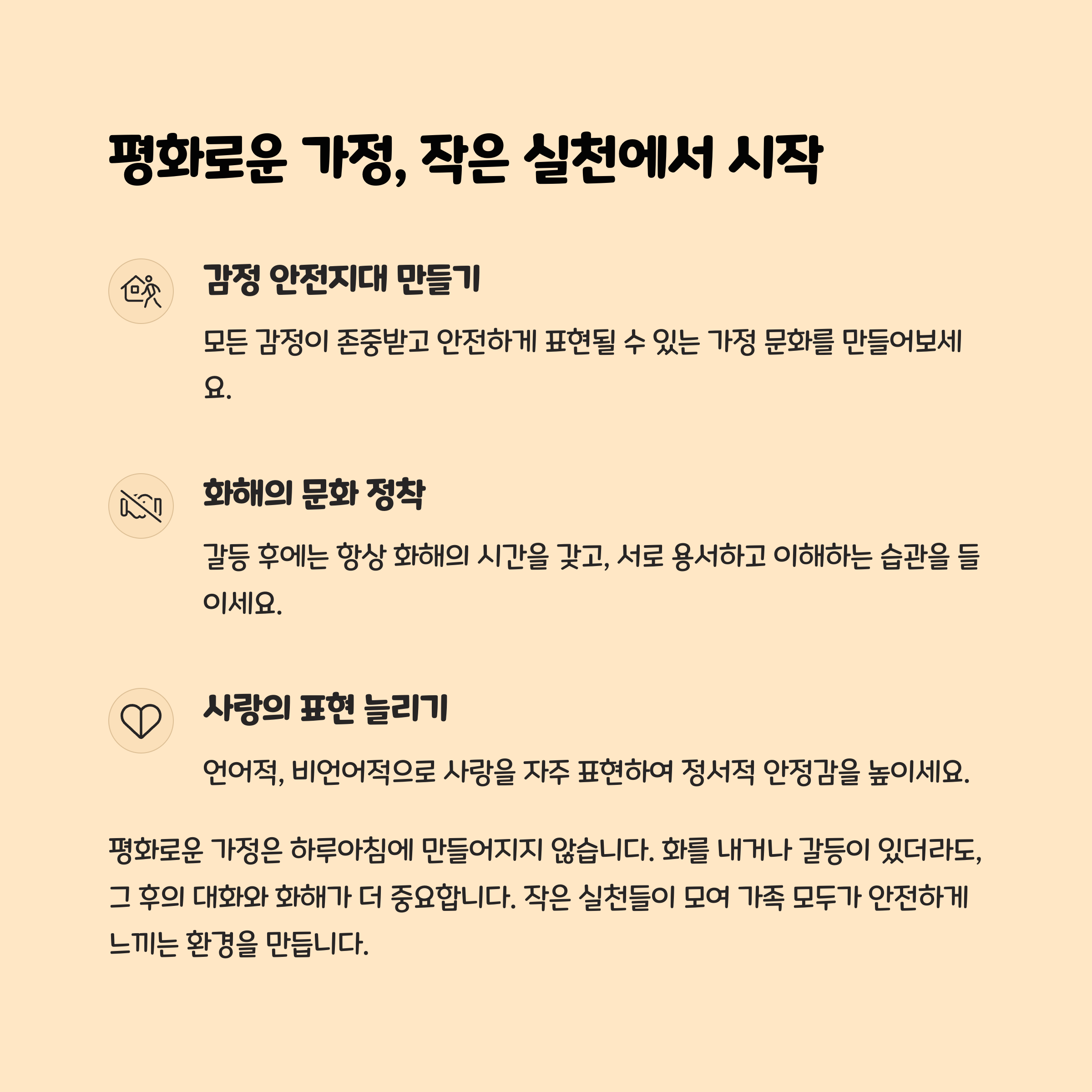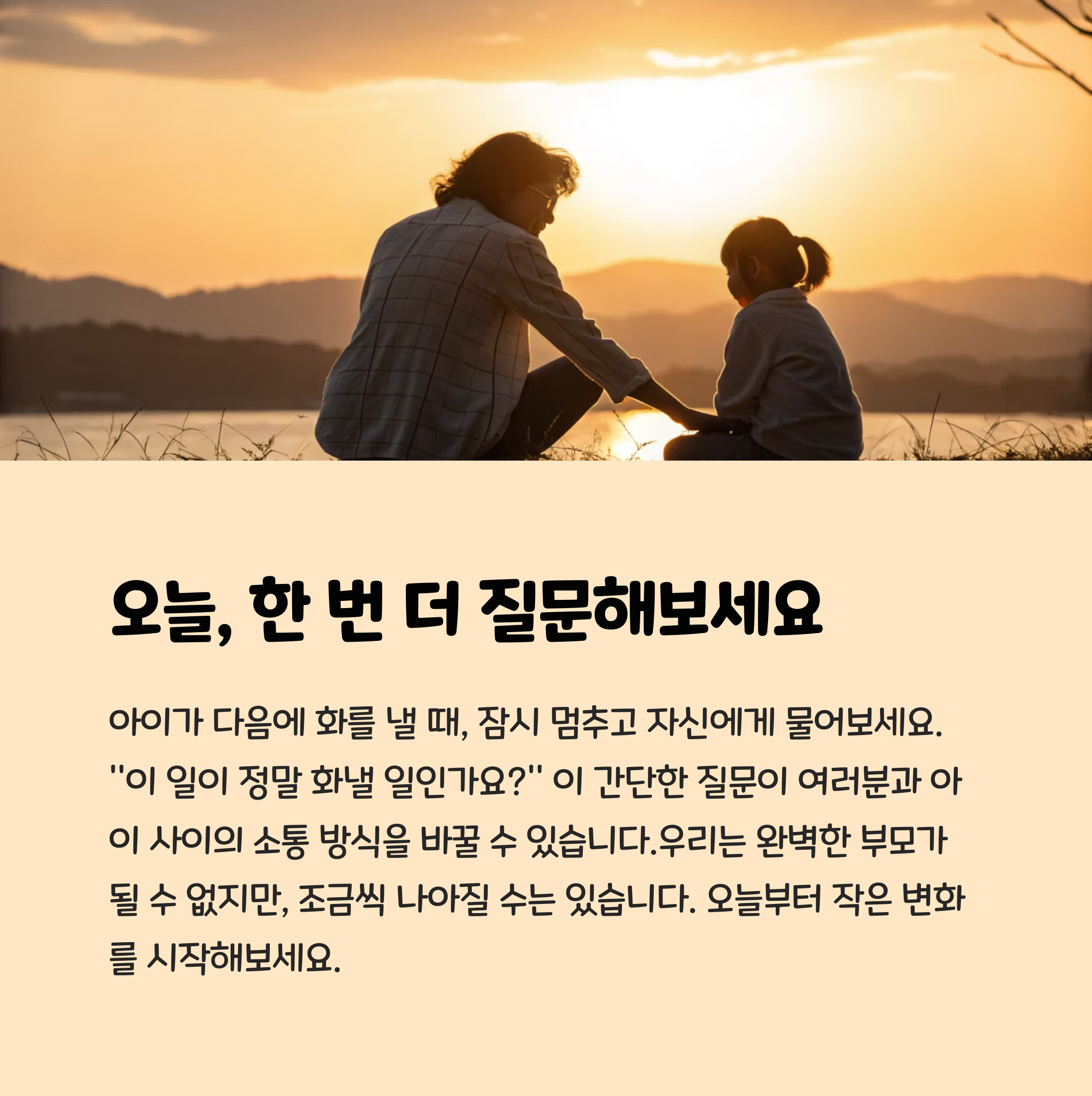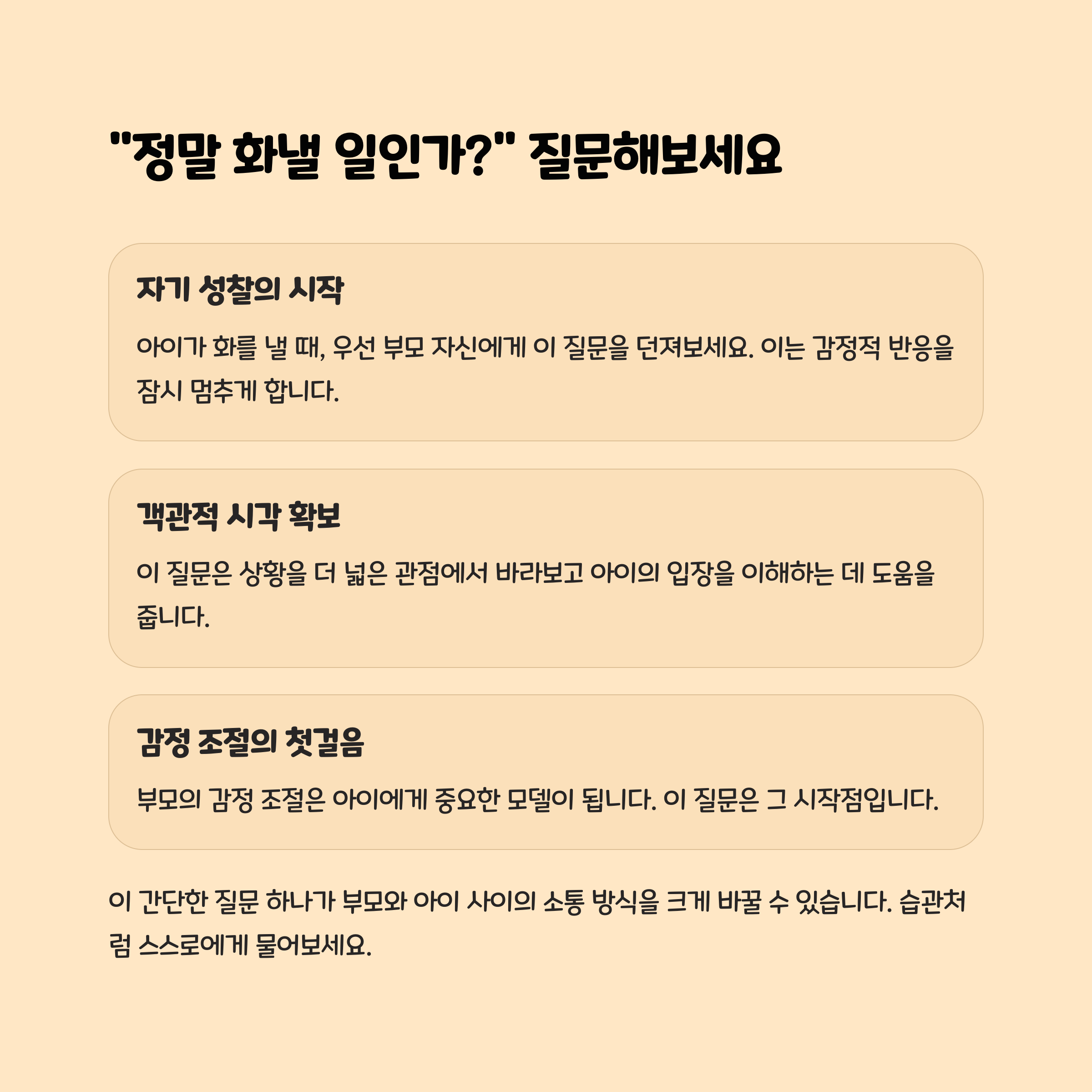 - 감정 조절 : 반복적으로 화를 내는 것은 아이에게도 부모에게도 부정적인 영향을 미칩니다. 이 질문은 부모가 자신의 감정을 통제하고 상황을 객관적으로 바라볼 수 있도록 돕습니다.