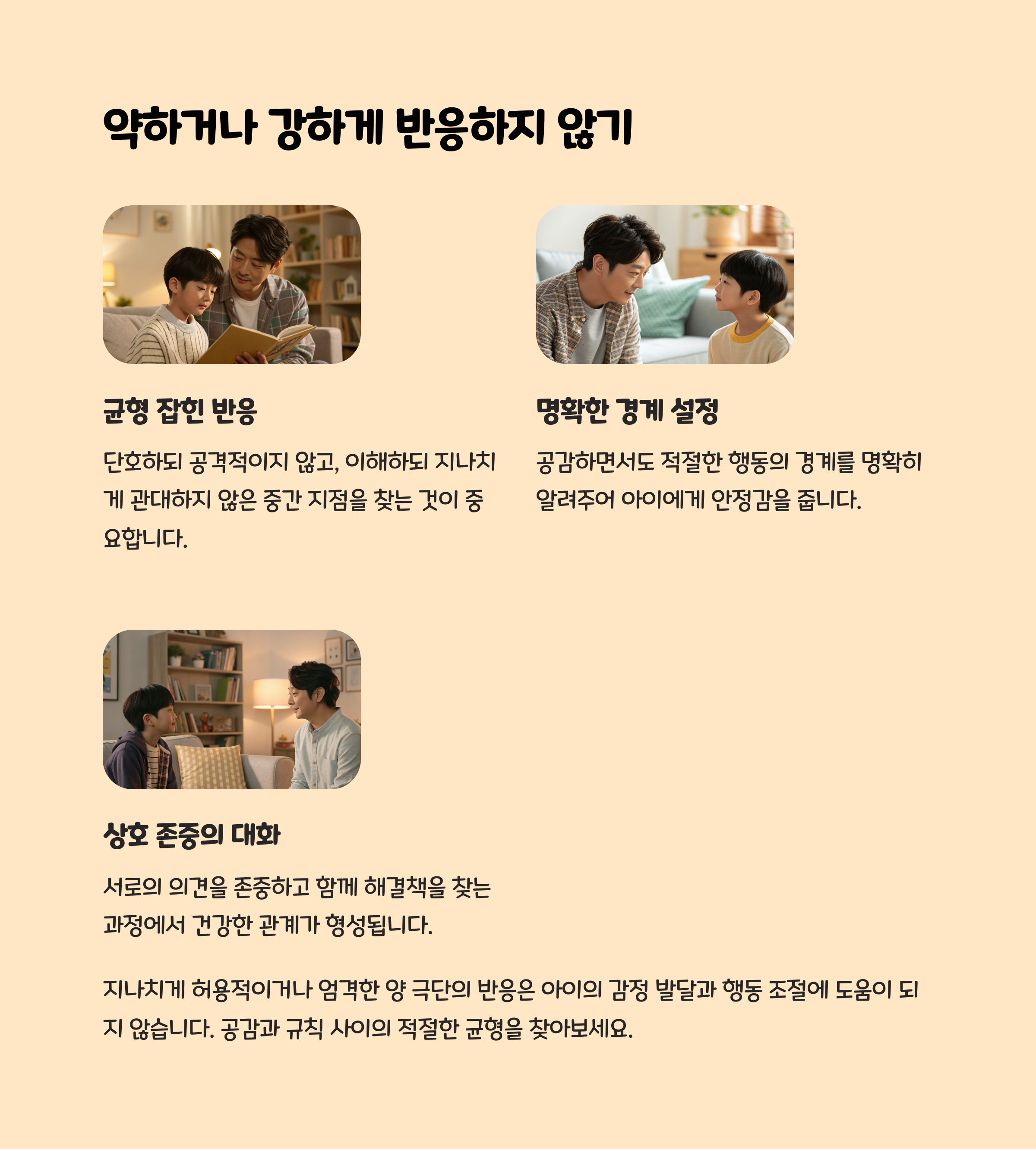 부모가 아이의 부정적인 행동에 지나치게 약한 모습을 보이면, 아이는 자신이 원하는 것을 얻기 위해 이런 행동을 반복할 가능성이 높습니다. 부모는 안정적이고 단단한 모습을 유지하며 아이에게 올바른 메시지를 전달해야 합니다.