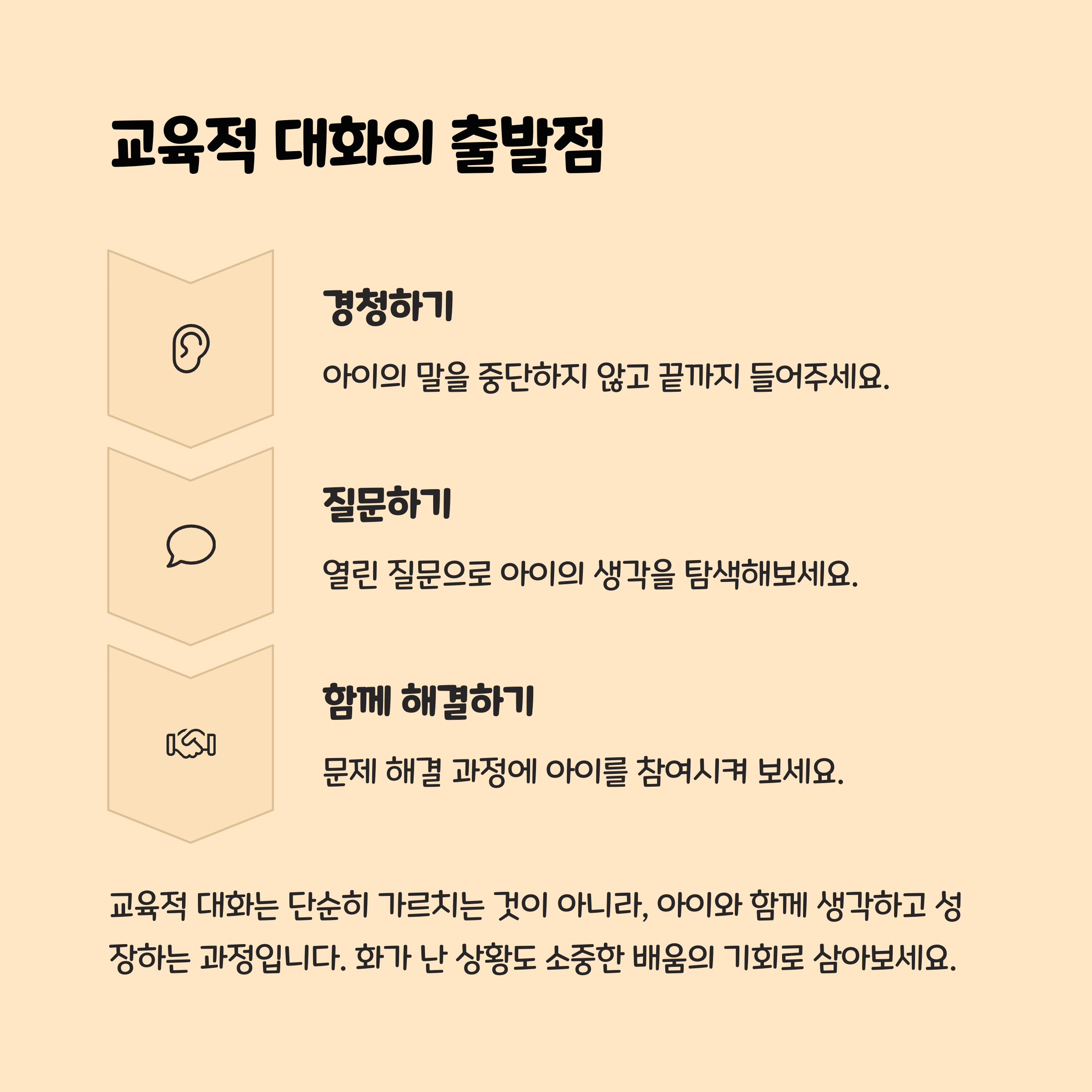 - 교육적 기회 : 아이의 잘못된 행동을 교육의 기회로 삼아야 합니다. 화를 내는 대신, 아이와 대화를 통해 문제의 원인을 파악하고 해결 방법을 모색할 수 있습니다.