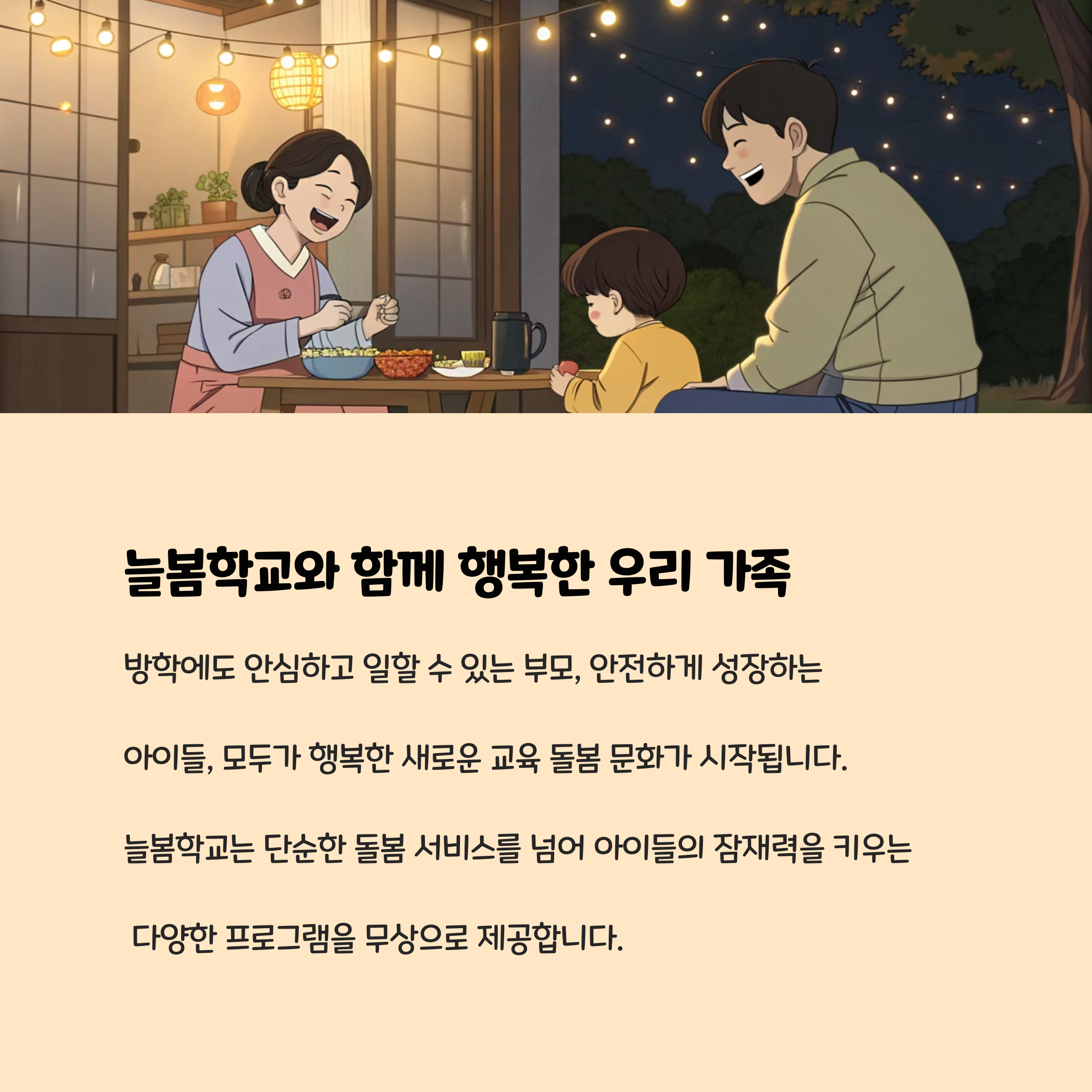 늘봄학교는 맞벌이 부모의 방학 돌봄 고민을 실질적으로 해결해 주는 국가책임 교육·돌봄 플랫폼으로 자리 잡고 있습니다. 운영 시간 확대, 무상 맞춤형 프로그램, 안전한 귀가 지원, 높은 만족도와 참여율 등 모든 면에서 기존 돌봄교실을 뛰어넘는 혜택을 제공합니다.