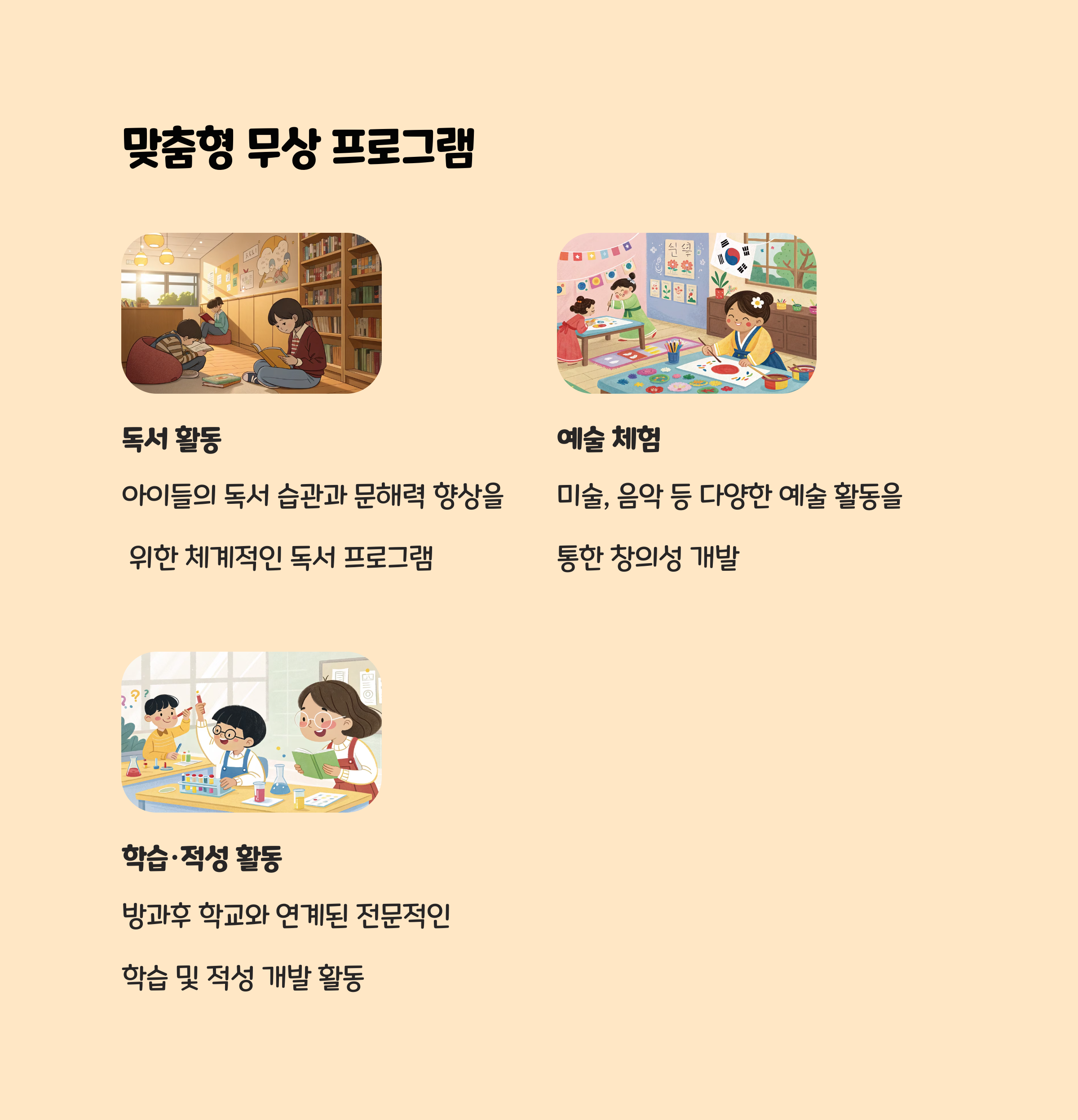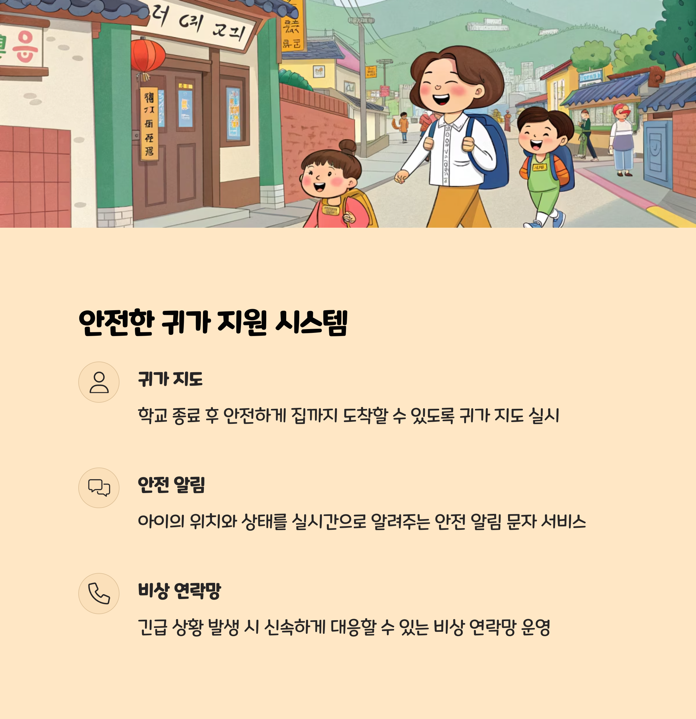 무상 맞춤형 프로그램: 1~2학년 학생에게 매일 2시간 이상 예체능, 창의융합, 디지털 등 다양한 활동이 무료로 제공됩니다.방학 중 급식 및 간식 지원: 점심 급식은 물론, 간식까지 제공해 아이의 건강까지 챙깁니다.귀가 지원 인력 강화: 2025년 3월 기준, 귀가 지원 인력이 7,200명 이상 추가 배치되어 방학 중에도 안전한 등하교가 가능합니다.특화 프로그램: AI, 코딩, 환경, 체육 등 미래 역량을 키우는 방과 후 활동이 확대됩니다.