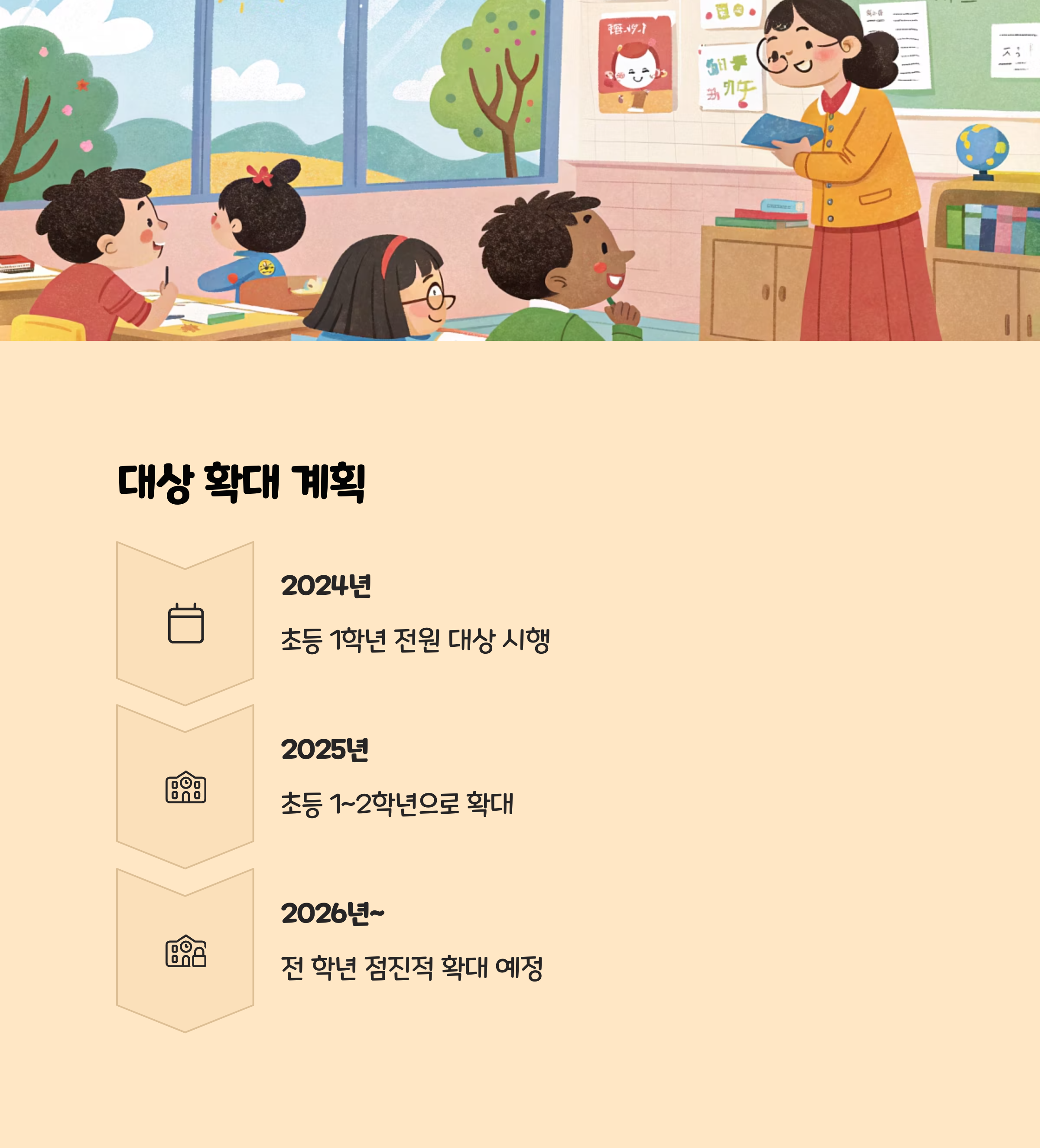 2025년부터 늘봄학교는 초등학교 1~2학년 학생 전원에게 집중 지원됩니다. 2024년에는 1학년만 대상이었지만, 2025년에는 2학년까지 확대되어 더 많은 가정이 혜택을 볼 수 있습니다. 특히 맞벌이·한부모 가정은 우선적으로 신청할 수 있어 방학 동안 돌봄 공백 걱정을 크게 덜 수 있습니다.
