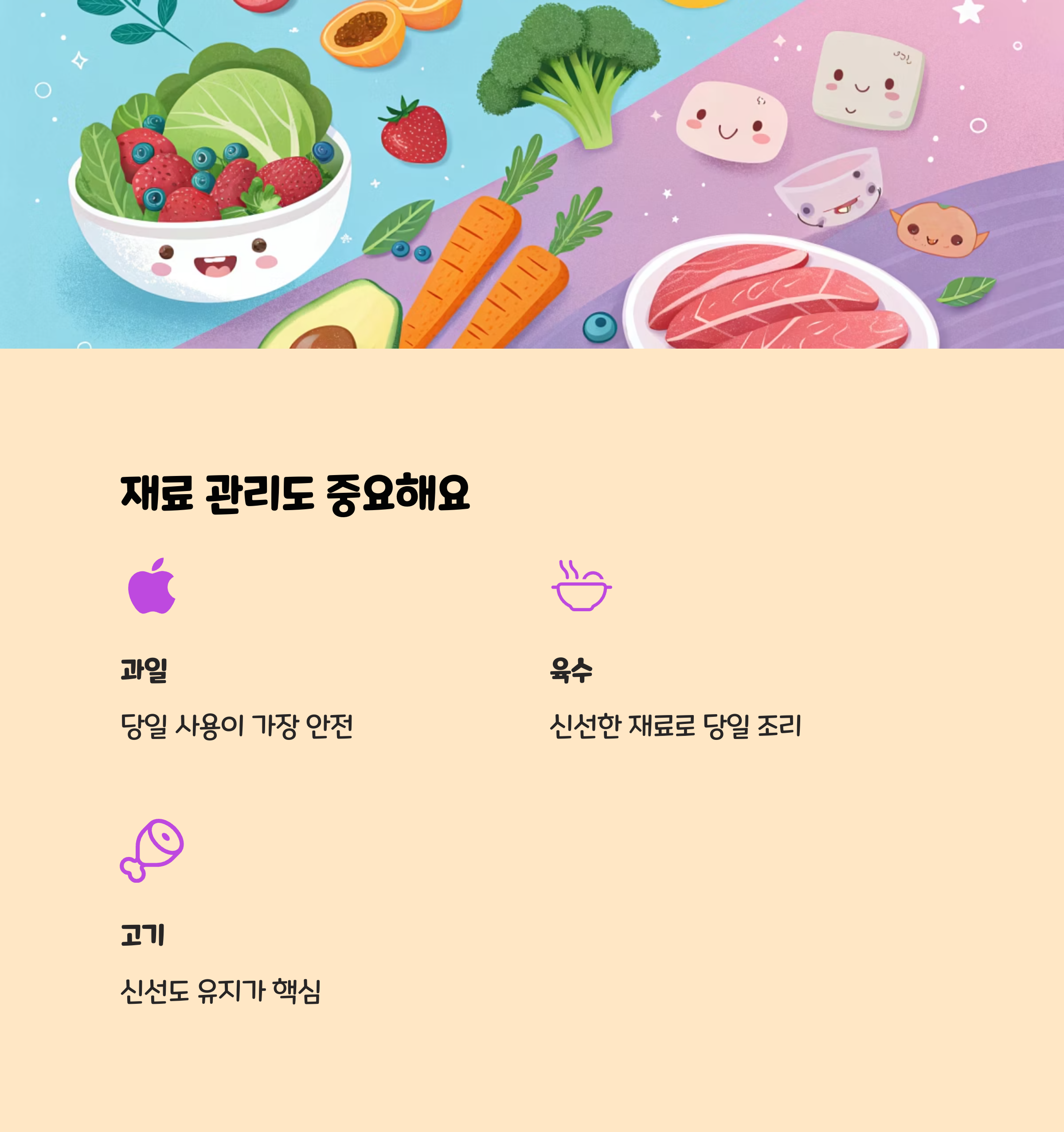- 과일, 육수, 고기 등은 당일 사용하는 것이 가장 안전합니다.
