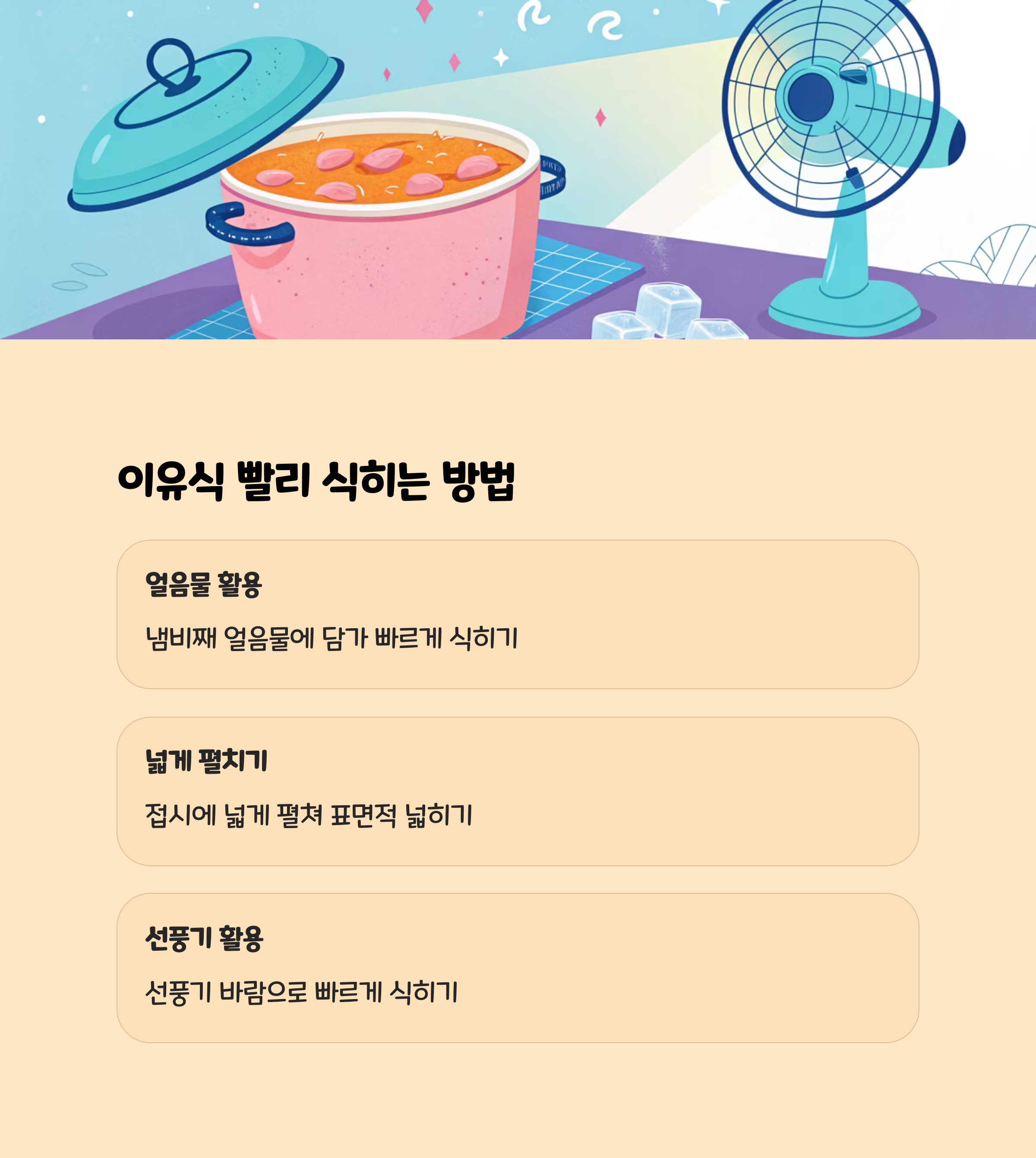- 냄비째 얼음물에 담그거나, 접시에 넓게 펼쳐 선풍기 바람을 쐬면 빠르게 식힙니다.