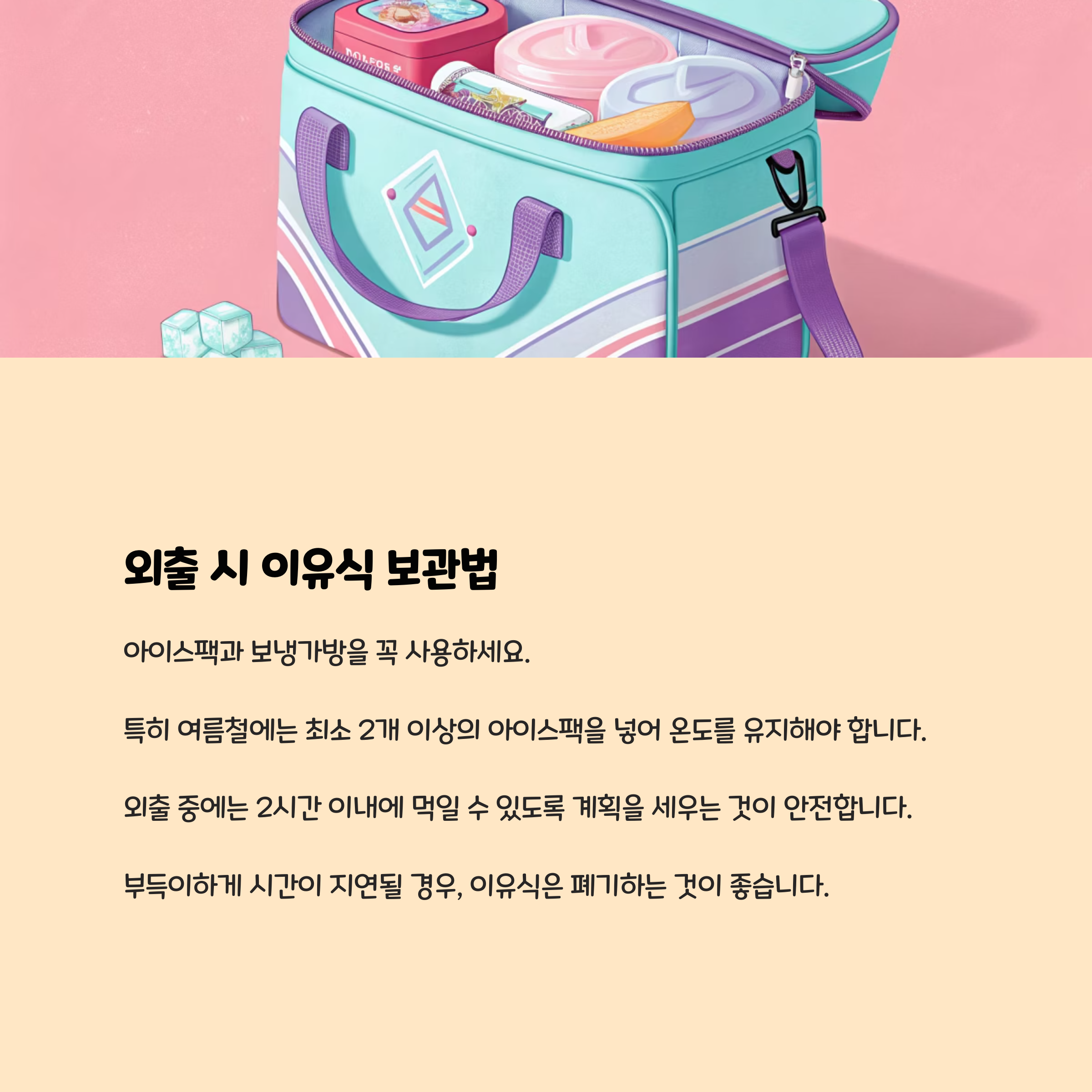 - 외출 중에는 2시간 이내에 먹일 수 있도록 계획을 세우는 것이 안전합니다.