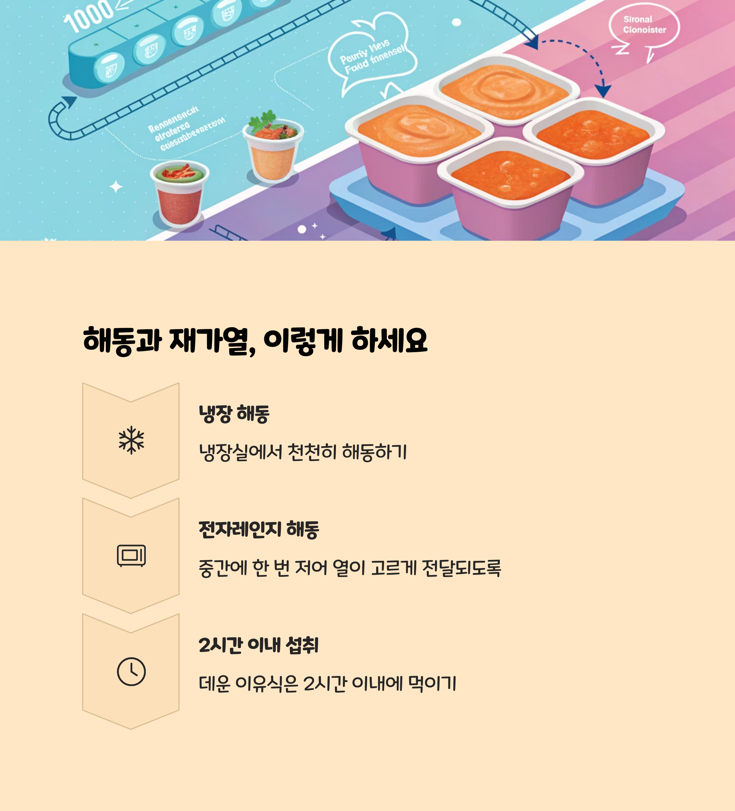 - 전자레인지로 해동할 때는 중간에 한 번 저어주어야 열이 고르게 전달됩니다.