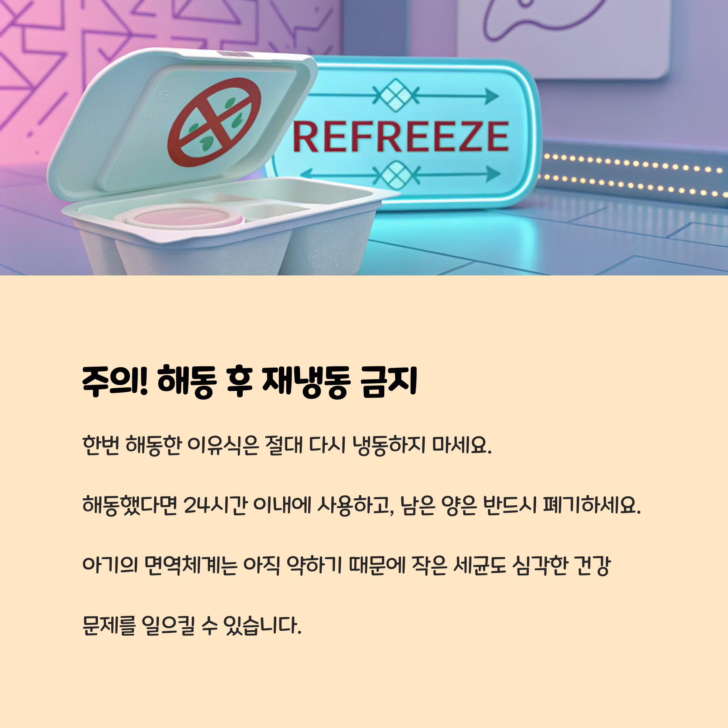 해동 후 재냉동은 절대 금지: 세균 증식 위험이 높아집니다.숟가락이 닿은 이유식은 즉시 폐기: 입에 닿은 숟가락은 세균을 옮길 수 있습니다.남은 이유식 재사용 금지: 아깝더라도 남은 것은 바로 버리세요.