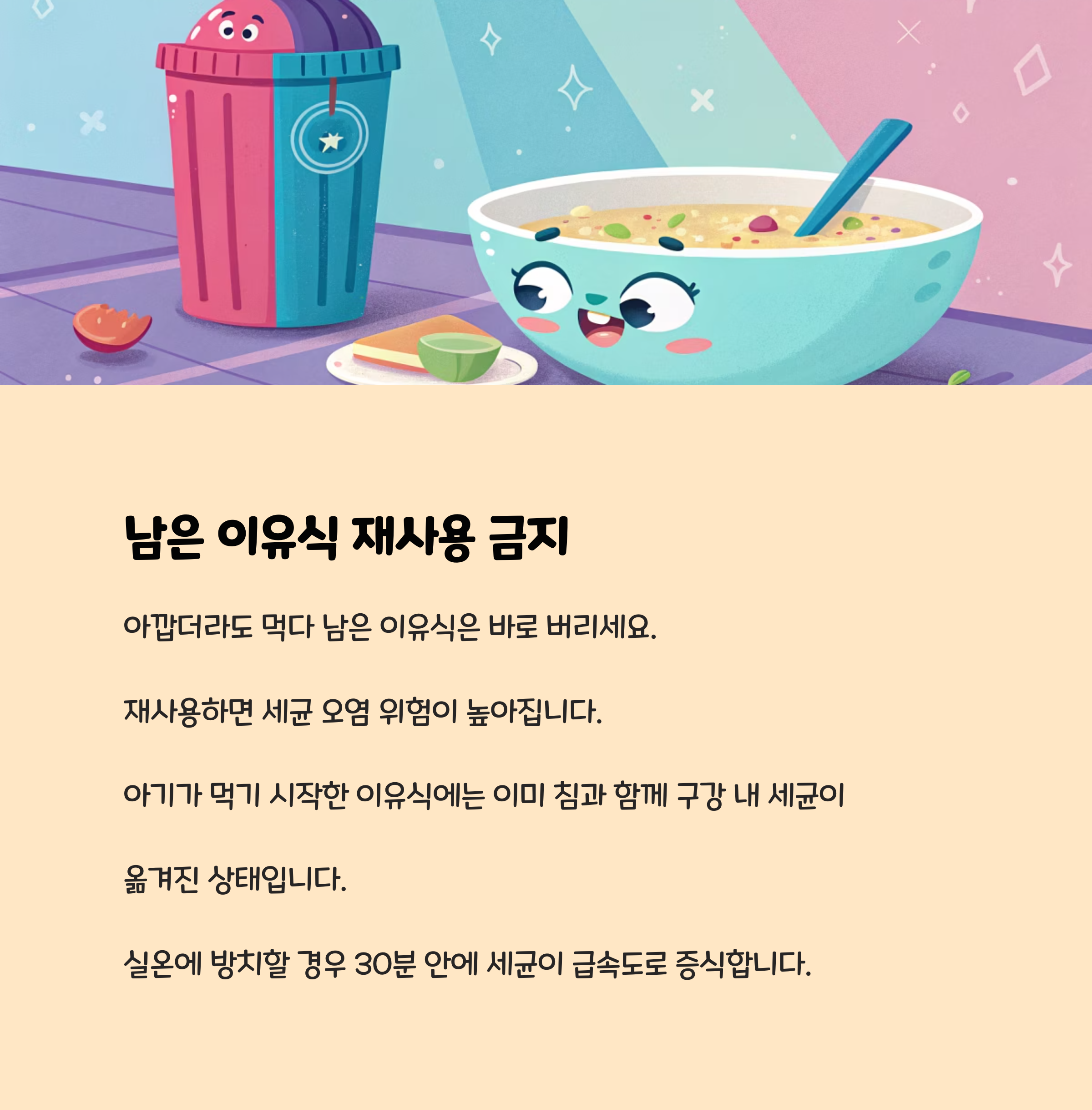 데운 이유식은 세균 증식 위험이 높아지므로 절대 재사용하지 말고 바로 폐기해야 합니다. 아기가 먹다 남긴 이유식은 입에 닿은 숟가락을 통해 세균이 옮겨질 수 있으니, 남은 이유식은 아깝더라도 버리는 것이 안전합니다.