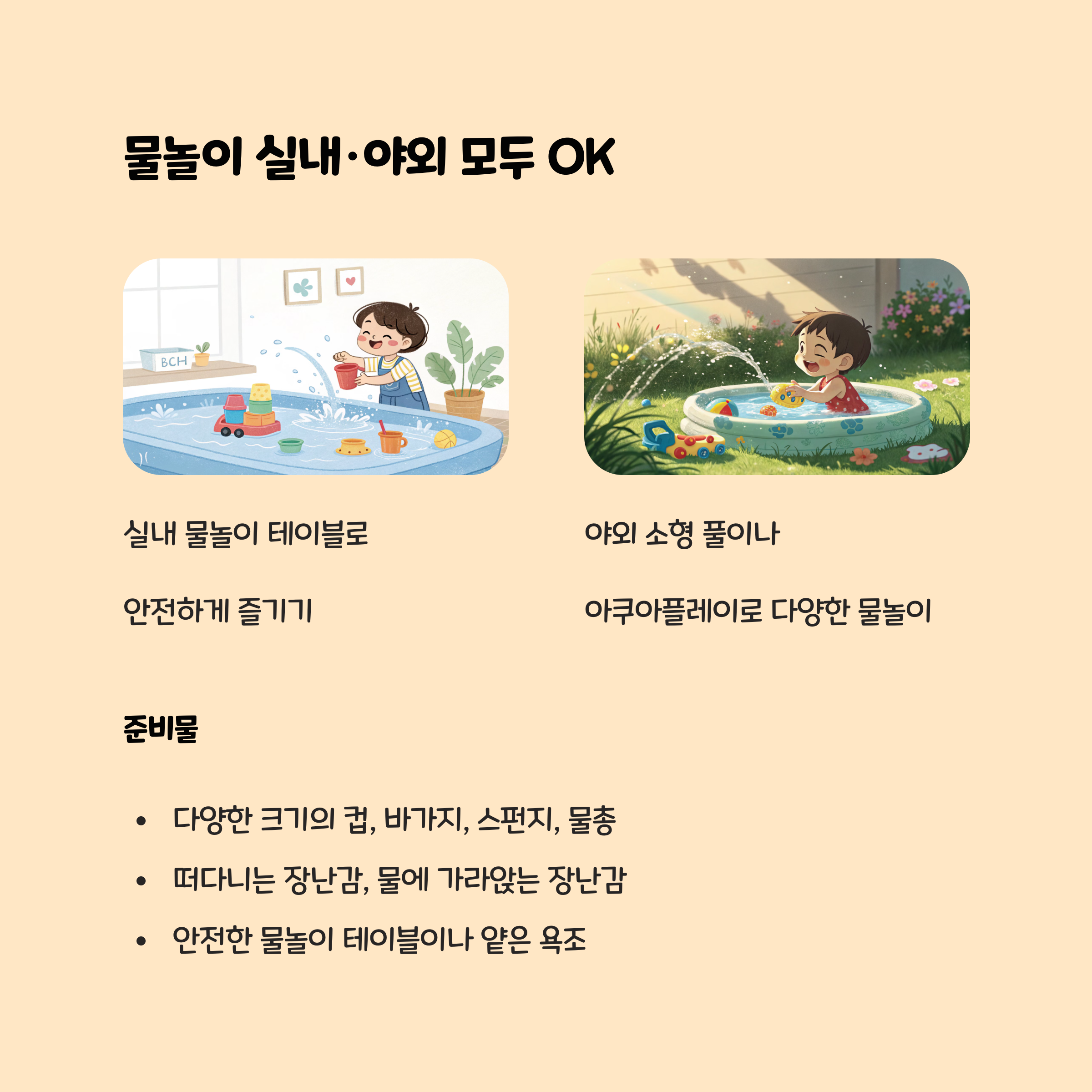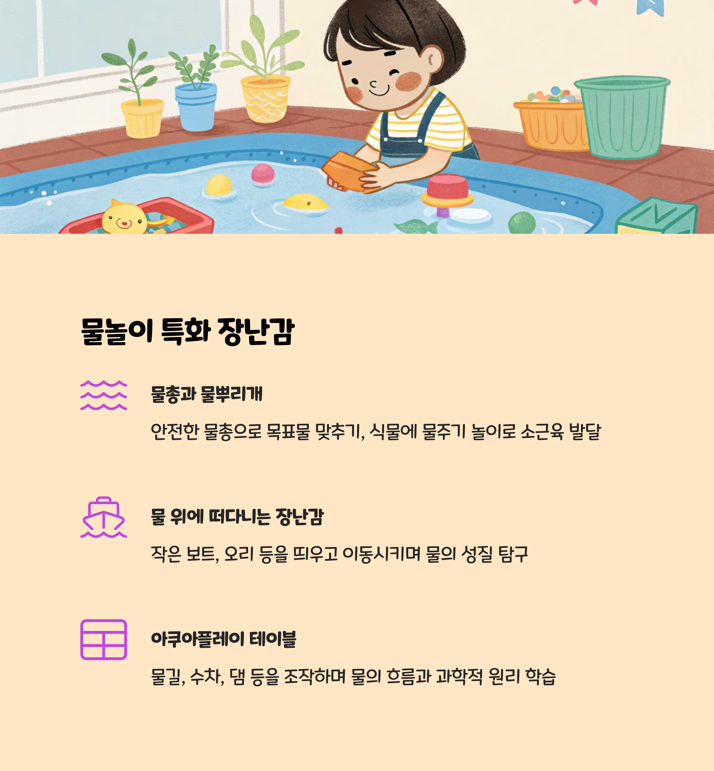 | 전 연령 | 물놀이 테이블, 물풍선, 아쿠아플레이 | 물의 흐름 관찰, 손 조작, 역할놀이, 시원한 촉감 경험 |