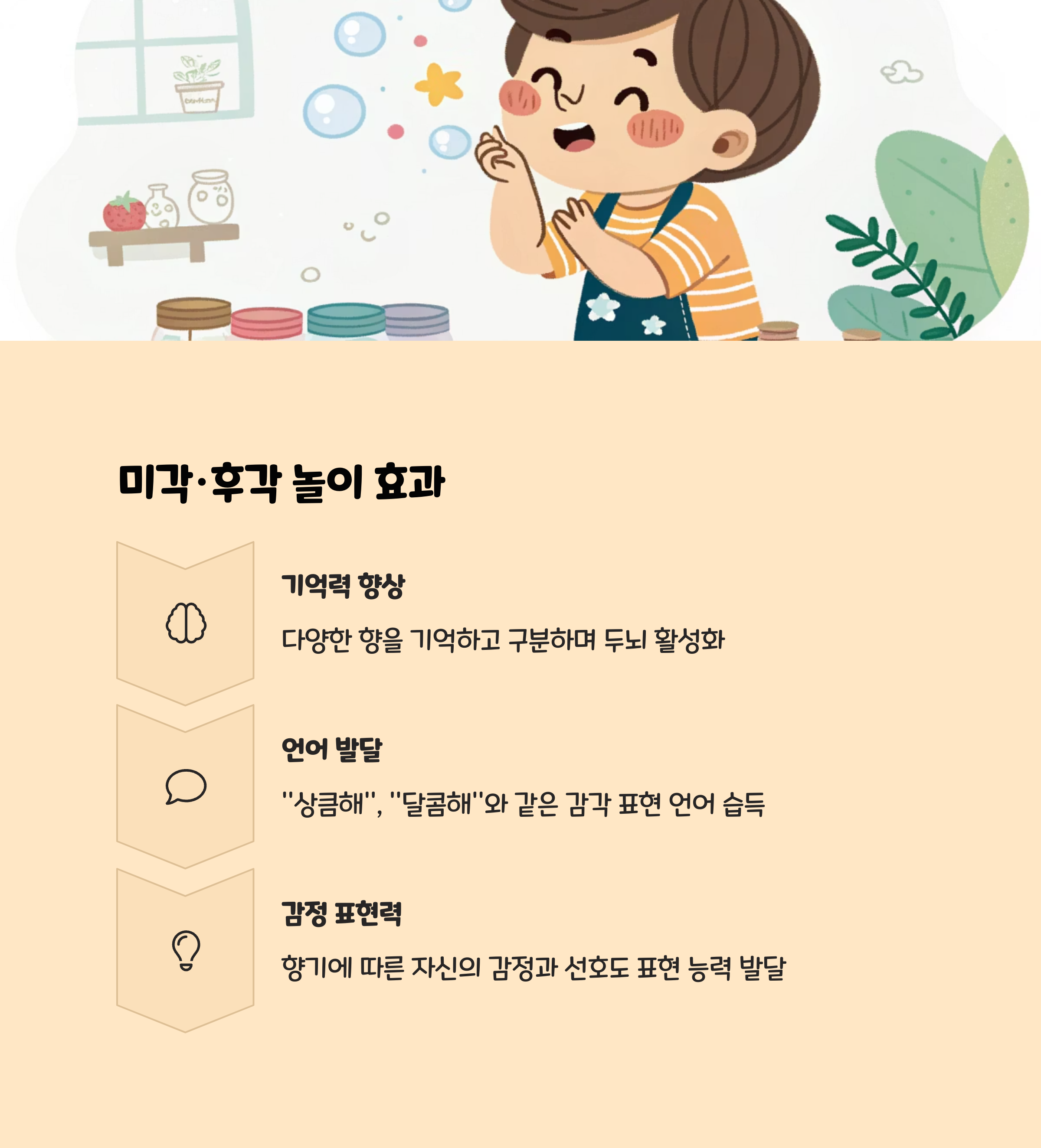 - 다양한 냄새를 맡아보고, "이 냄새는 어디서 맡아봤지?"라고 대화해 보세요.