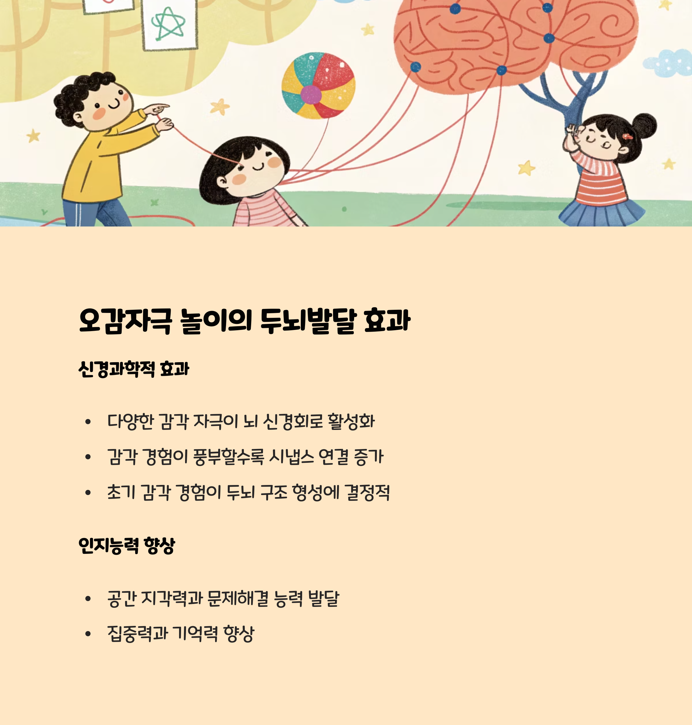 오감놀이는 뇌의 다양한 영역을 동시에 자극해 신경망을 촘촘하게 연결해 줍니다. 특히 영유아기는 두뇌 발달의 황금기이기 때문에, 다양한 감각 경험이 창의력, 문제해결력, 언어 능력 등 전반적인 인지 발달에 매우 긍정적인 영향을 미칩니다.