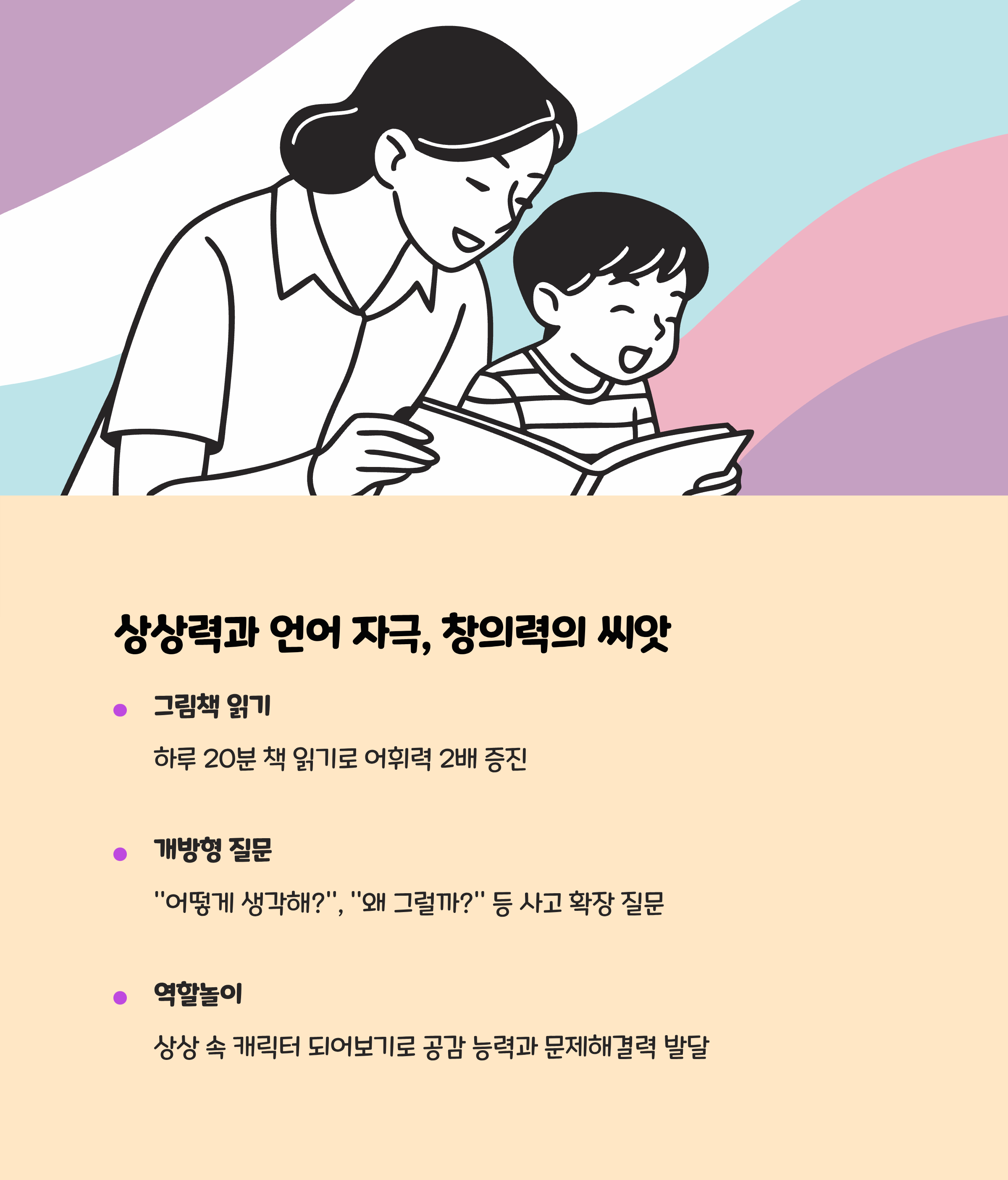 | 상상력과 언어 자극 | 창의력 향상, 두뇌 발달 바탕 마련 | 이야기 나누기, 상상 놀이, 질문 격려 |