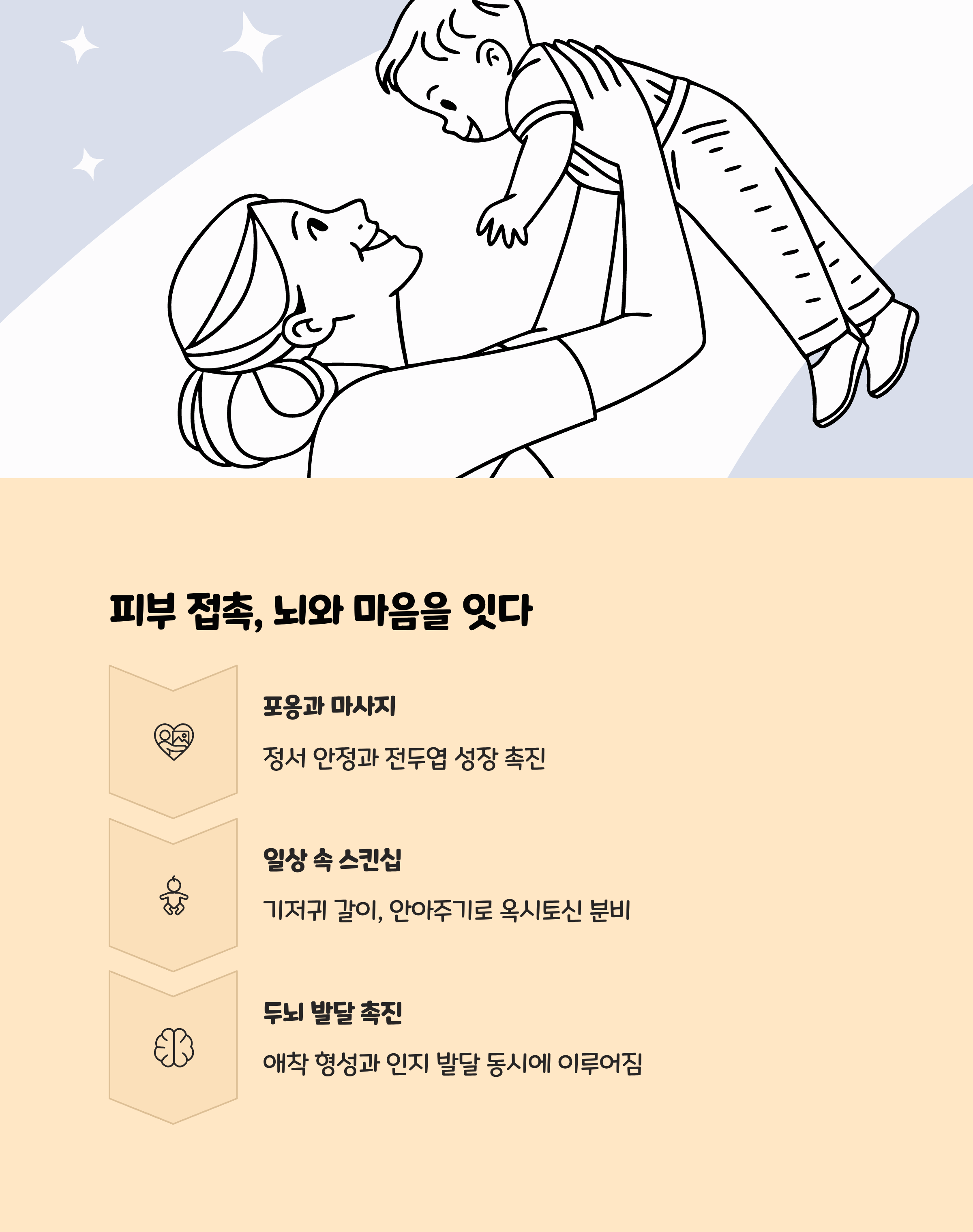 부모의 스킨십과 자주 웃어주기는 아이의 심리 안정과 애착 형성에 필수적이며, 정서 발달과 더불어 전두엽 성장까지 도와줍니다. 눈 맞춤과 따뜻한 포옹, 자주 웃어주기를 통해 아이는 뇌 발달에 긍정적인 자극을 받습니다.